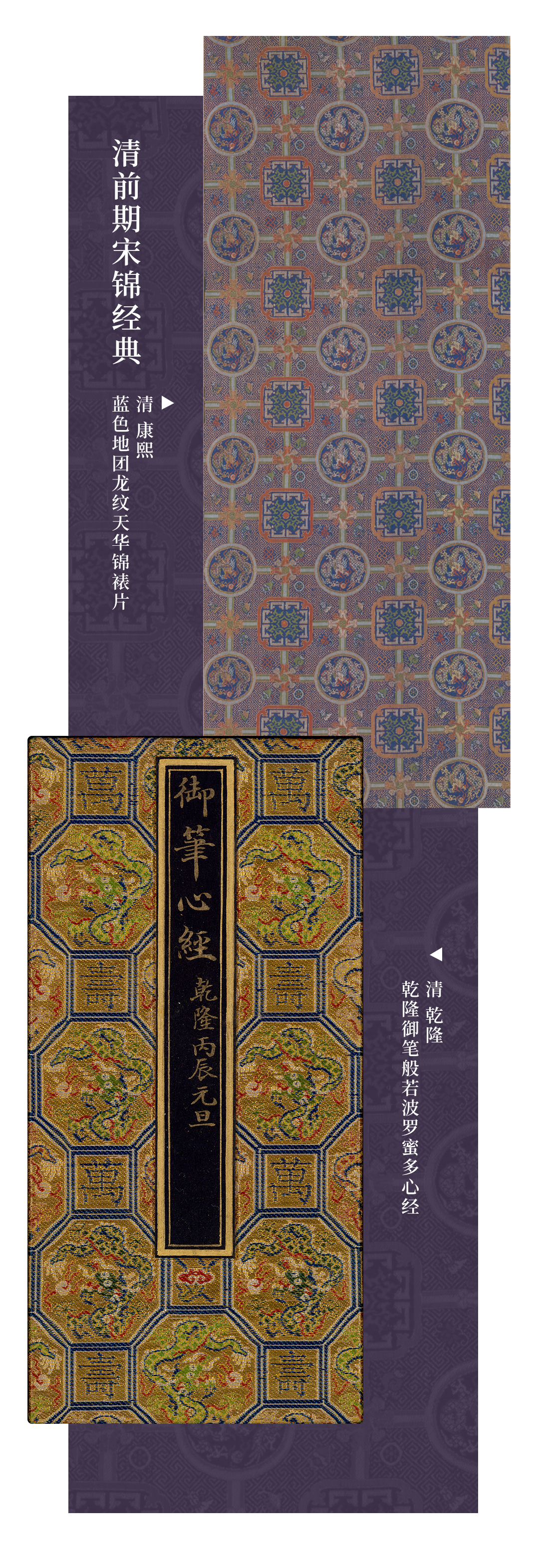 清代宫廷用锦以宋锦为风雅,以洋锦为时尚,以花锦为绮丽,以金锦为荣华。锦装遍布宫室、戏台、佛堂、书斋,与收藏珍玩的库房。清代锦承袭明锦,而在康雍乾三朝皇帝督促官营织造用心的经营下,创新颇多,形成了清代织锦的独特风格和新的时代面貌。