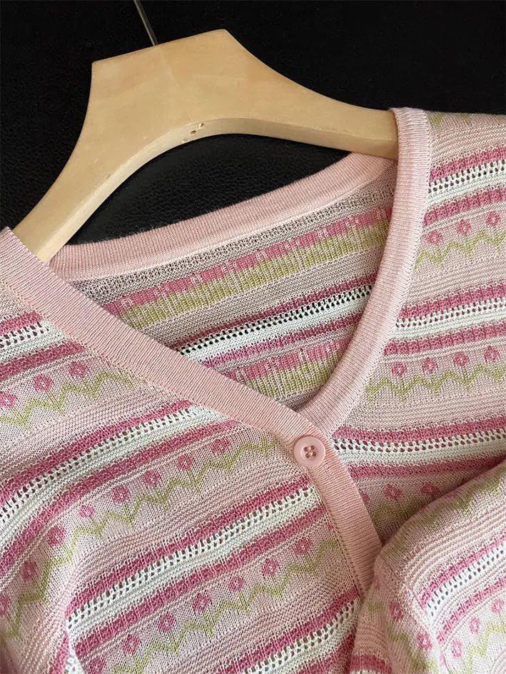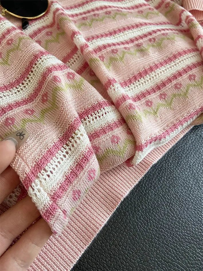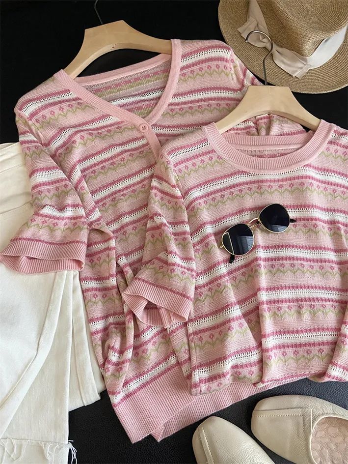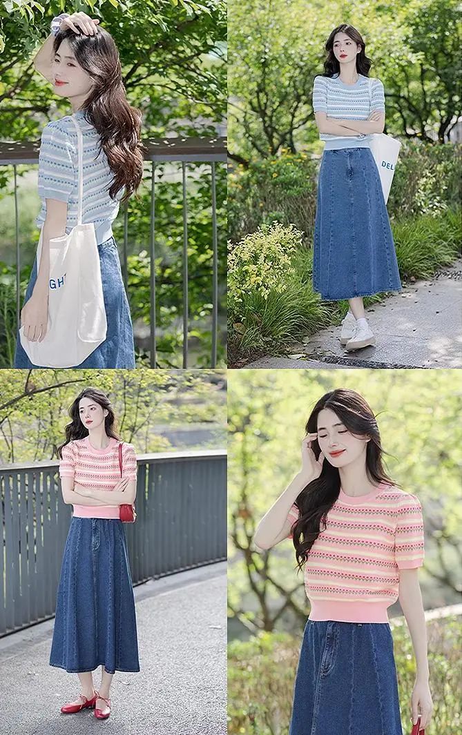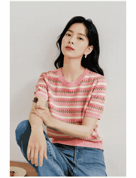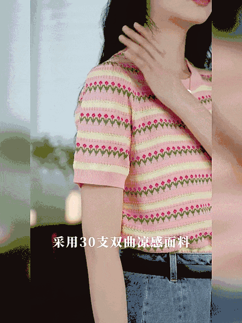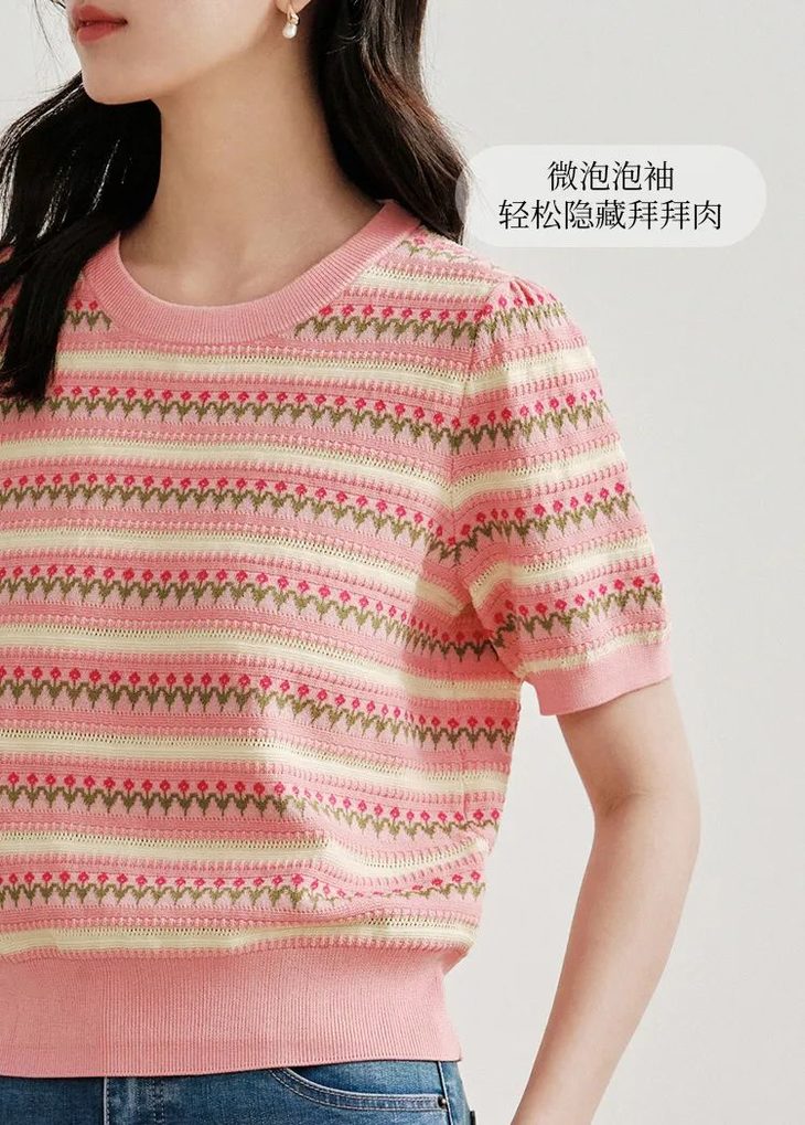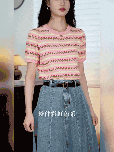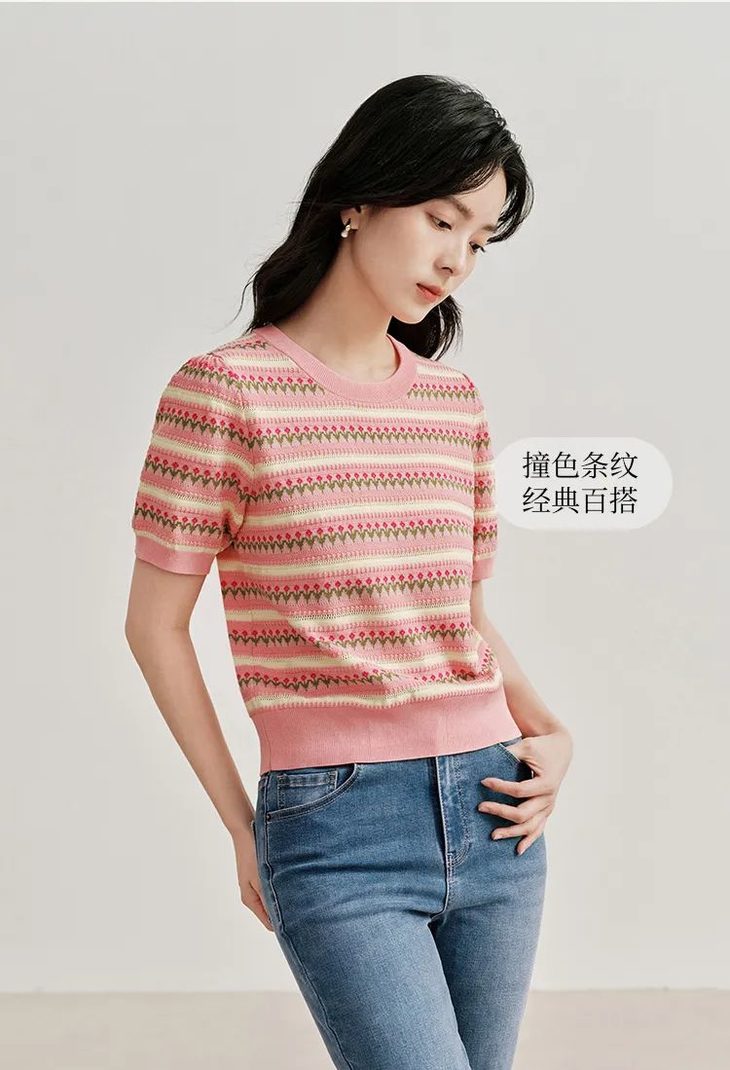 这款针织短袖款式简约,设计却不简单,撞色条纹编织+清爽针织花纹,清新甜美,提亮气质~