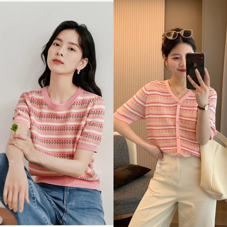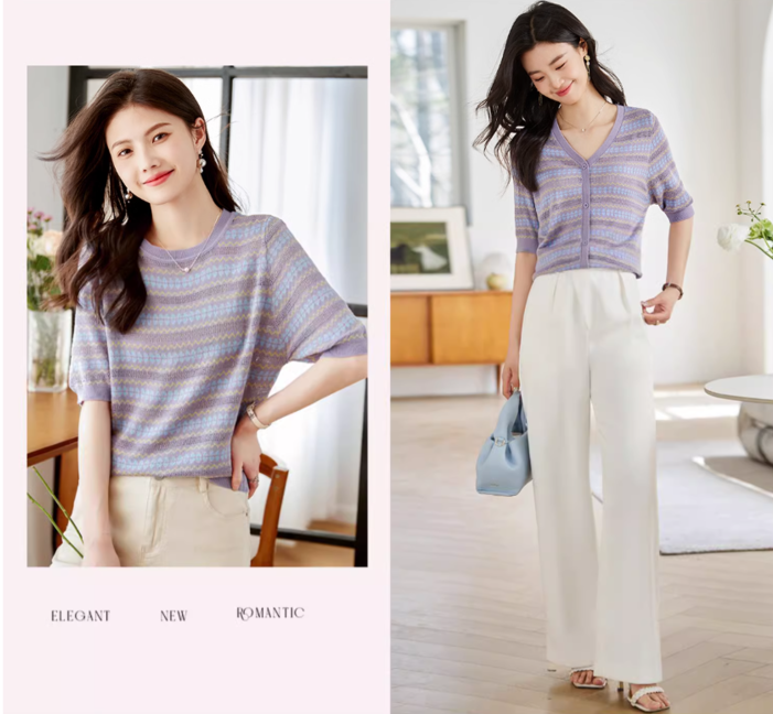 圆领T恤,V领假开衫两种款式,微透的薄厚度,可单穿、可外搭,随时适应无常的气温变幻~