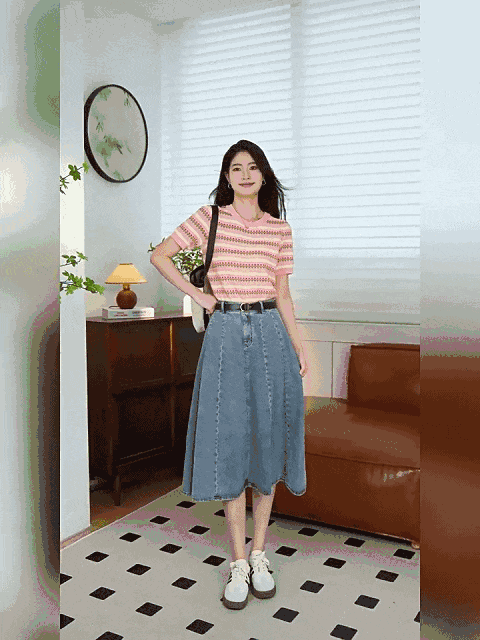 纵向针织条纹,拉伸着上半身的曲线,显瘦效果要比一般的T恤更加明显,还有种法式的慵懒感。