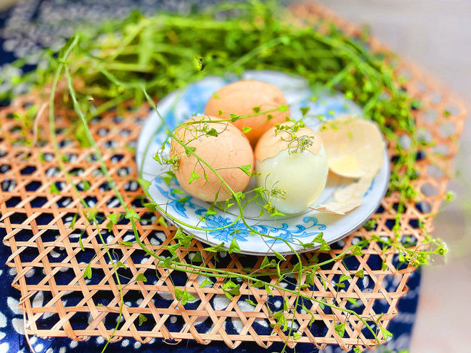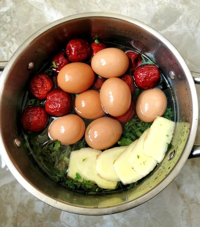 步骤一:将荠菜洗净,放入雪平锅内,把鸡蛋、红枣和姜片放在荠菜上面。
