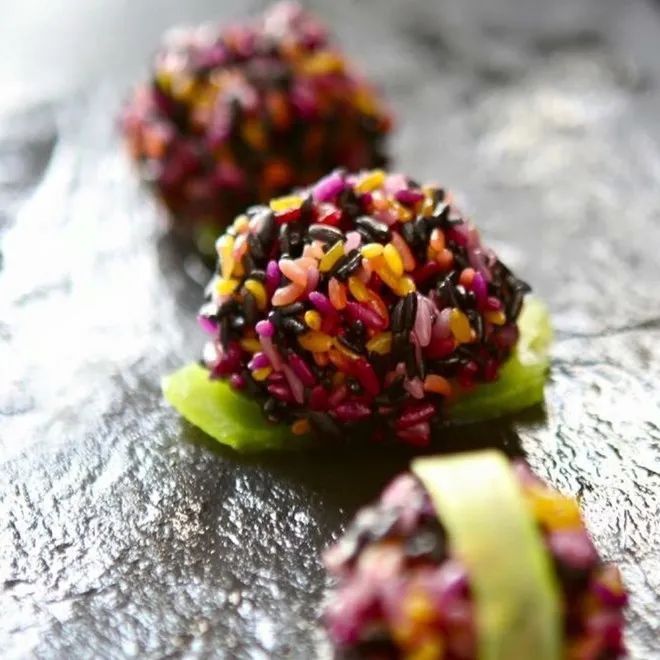 五色糯米饭,兼具黑、红、黄、紫、白(糯米本色)五种颜色,色彩鲜艳,米粒清香,有着五谷丰登的美好寓意。