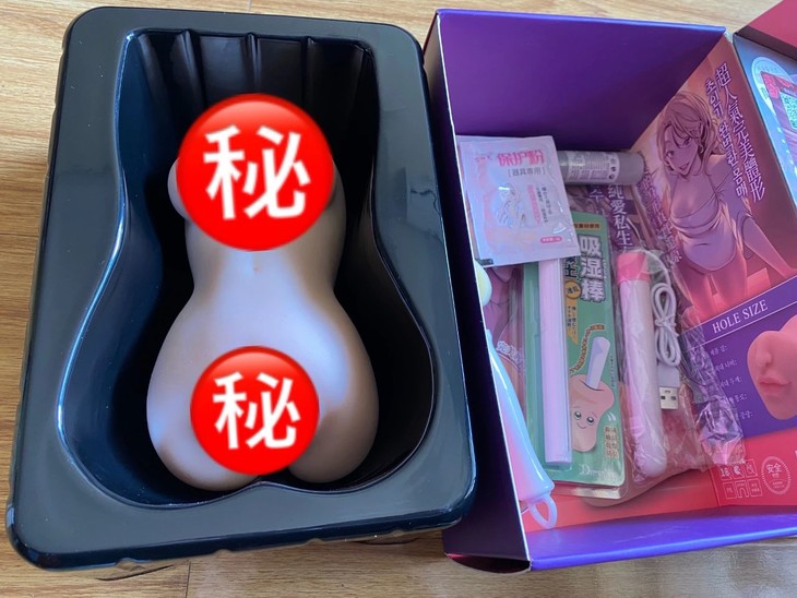 打开外表浮夸的包装盒,首先看到的是飞机杯本身(原本外面包包了两层塑料薄膜,为了拍摄效果,我就把薄膜撕掉了),以及随飞机杯附赠的一些配件:1小包润滑油,1根加热棒,一根清洗棒,一根吸湿棒,5包保养粉。