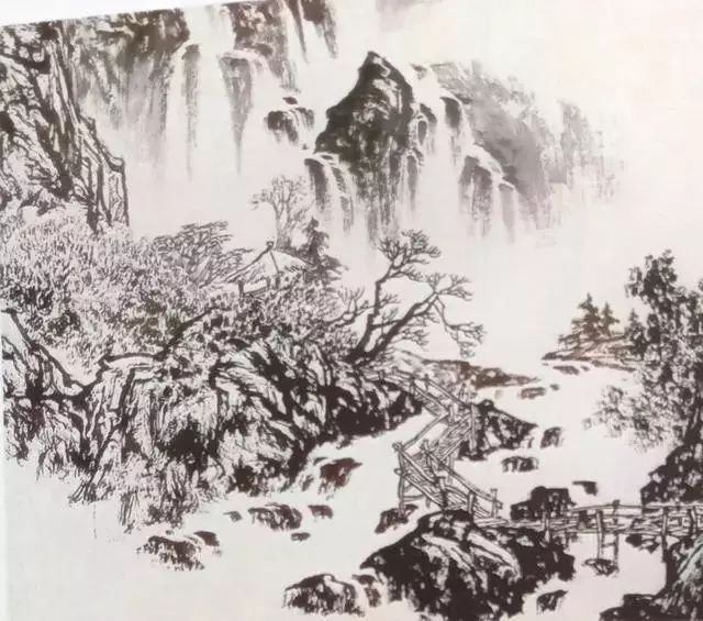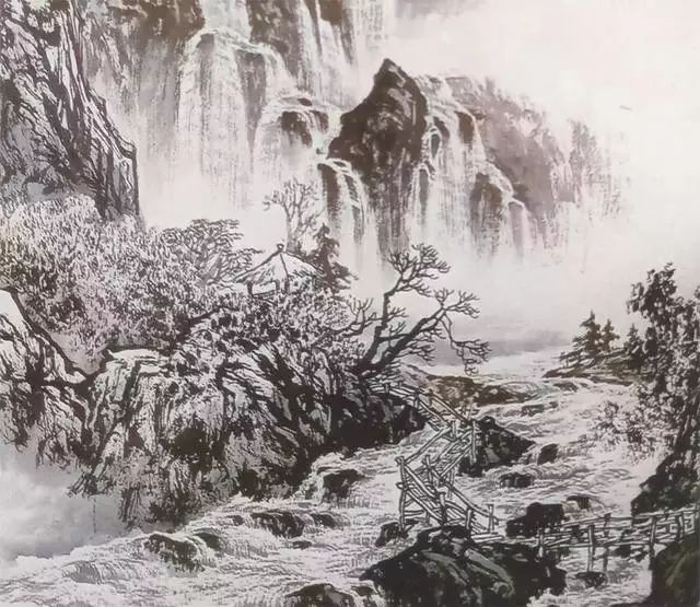这是表现瀑布的画法。瀑布顺势直泻而下,非常壮观。画时注意瀑布两边的山石不要留白,以村托瀑布显得更亮。