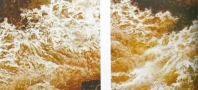 这是一种台阶式的流水画法。原本平静的水流,突然到有一定落差的合阶,就会产生很漂亮的水纹,画时注意瀑布流下来产生的浪花,以及它们之间的衔接。