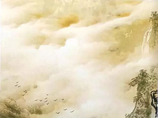 这是以云为主的构图。先要把山石画好,注意经营位置和密关系。等墨干后再用清水把纸打湿,调出同山相同的色,利用笔和水的巧妙结合,染出云的大致形状,最后用一样层淡的颜色统染,使云更加厚重。