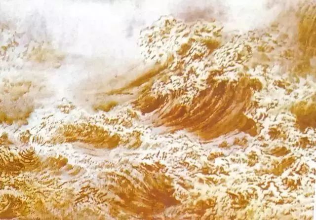 画波涛时,很容易画成一排一排的,没有变化,让人感觉呆板。应该像下图一样,把浪头画得有大小变化,互相穿插,画出浪花相互涌动的感觉。