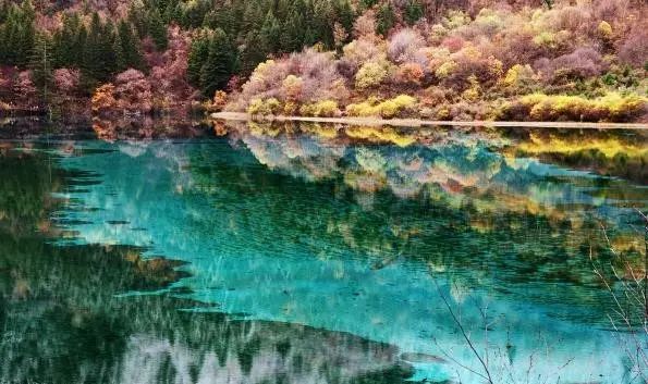 五花海可以说是九寨沟最精华的景色了。阳光刚出来时去游览五花海最合适不过。海底的钙华沉积和各种色泽艳丽的藻类、沉水植物,与湖畔旁各种绿色植物在水中的迷彩倒影共同勾勒出一个异彩缤纷的世界。