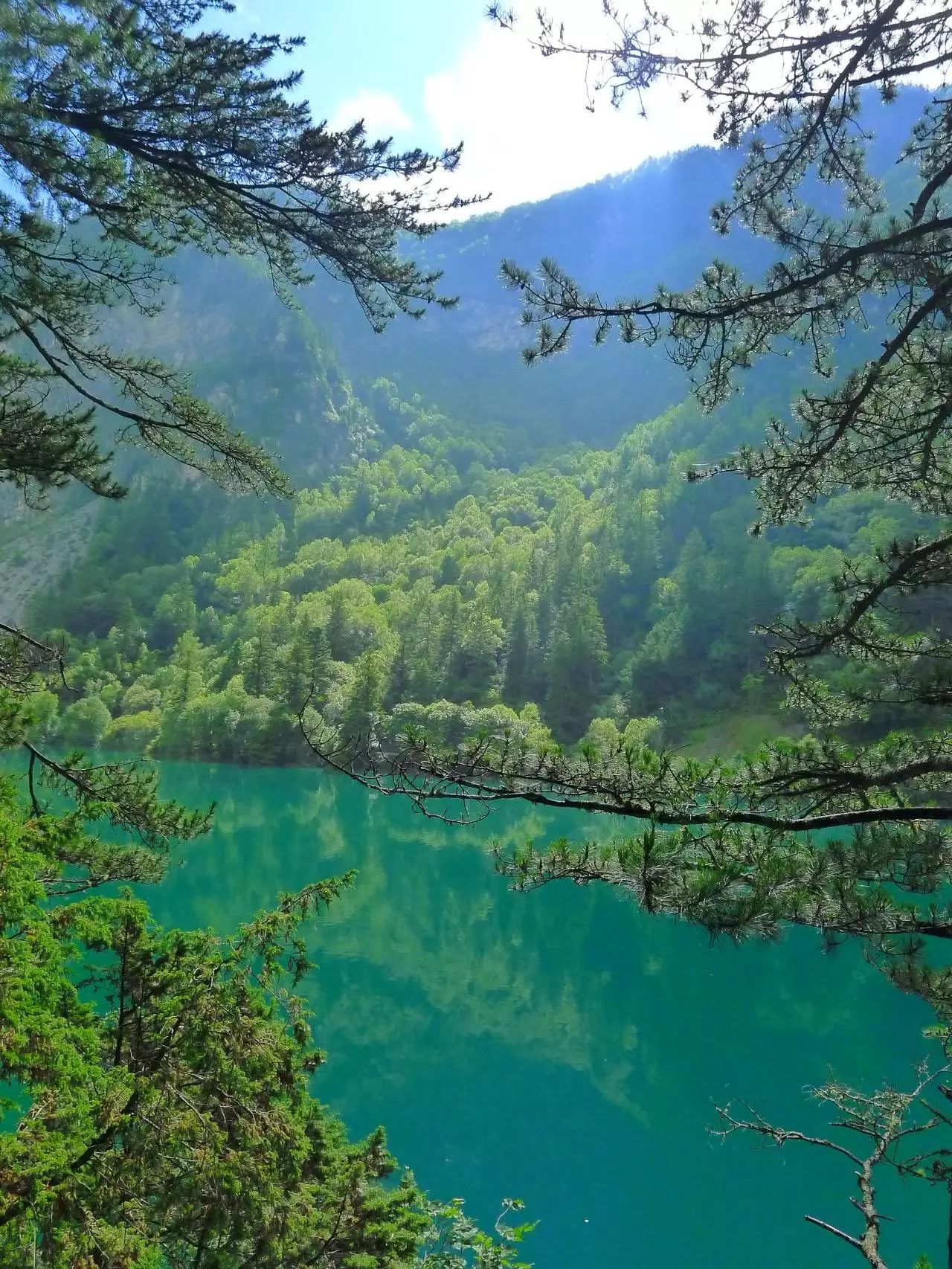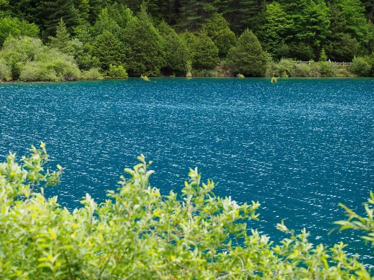 树正群海前后连绵数里,上下高差近百米,五彩的深山幽谷中,呈梯田状群集了19个大小不同的海子。在这些海子之间,长满柳、杨、松、杉等乔木以及种类众多的灌木丛。