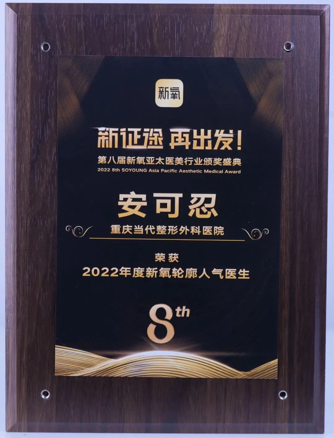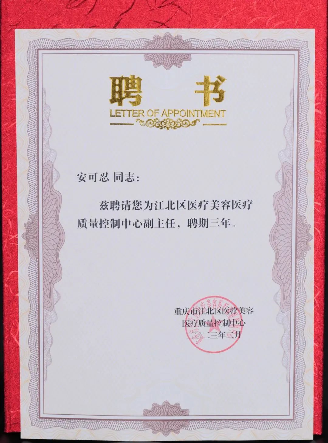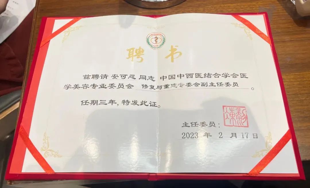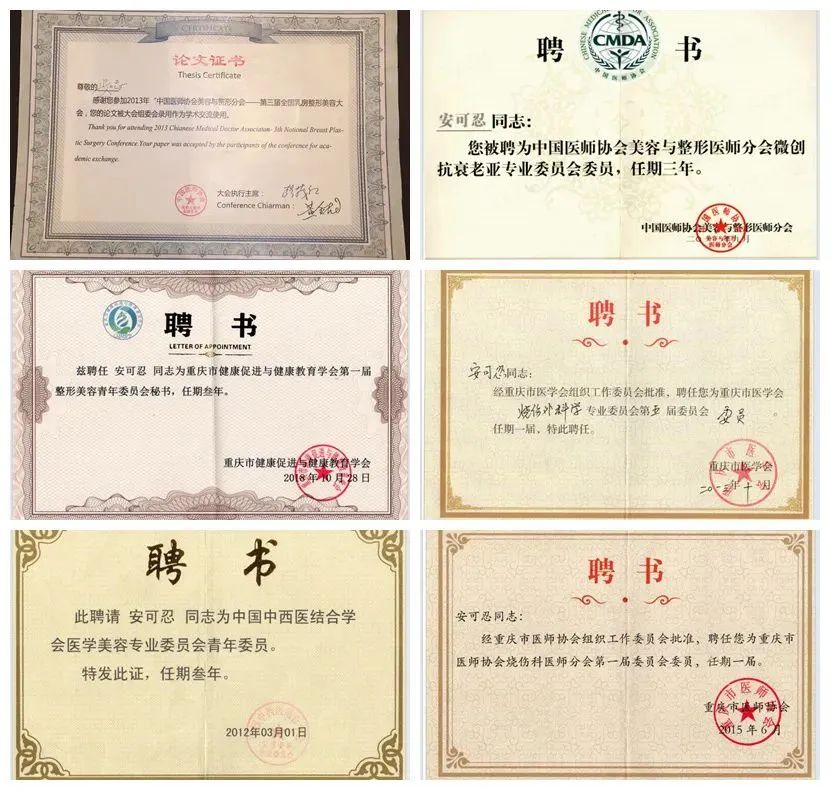 近20年专注整形领域,安院长在专业上已获得诸多认可,目前不仅是中国中西医结合学会医学美容专业委员会修复与重建专委会副主任委员,还是江北区医疗美容医疗质量控制中心副主任,拥有众多社会职务。