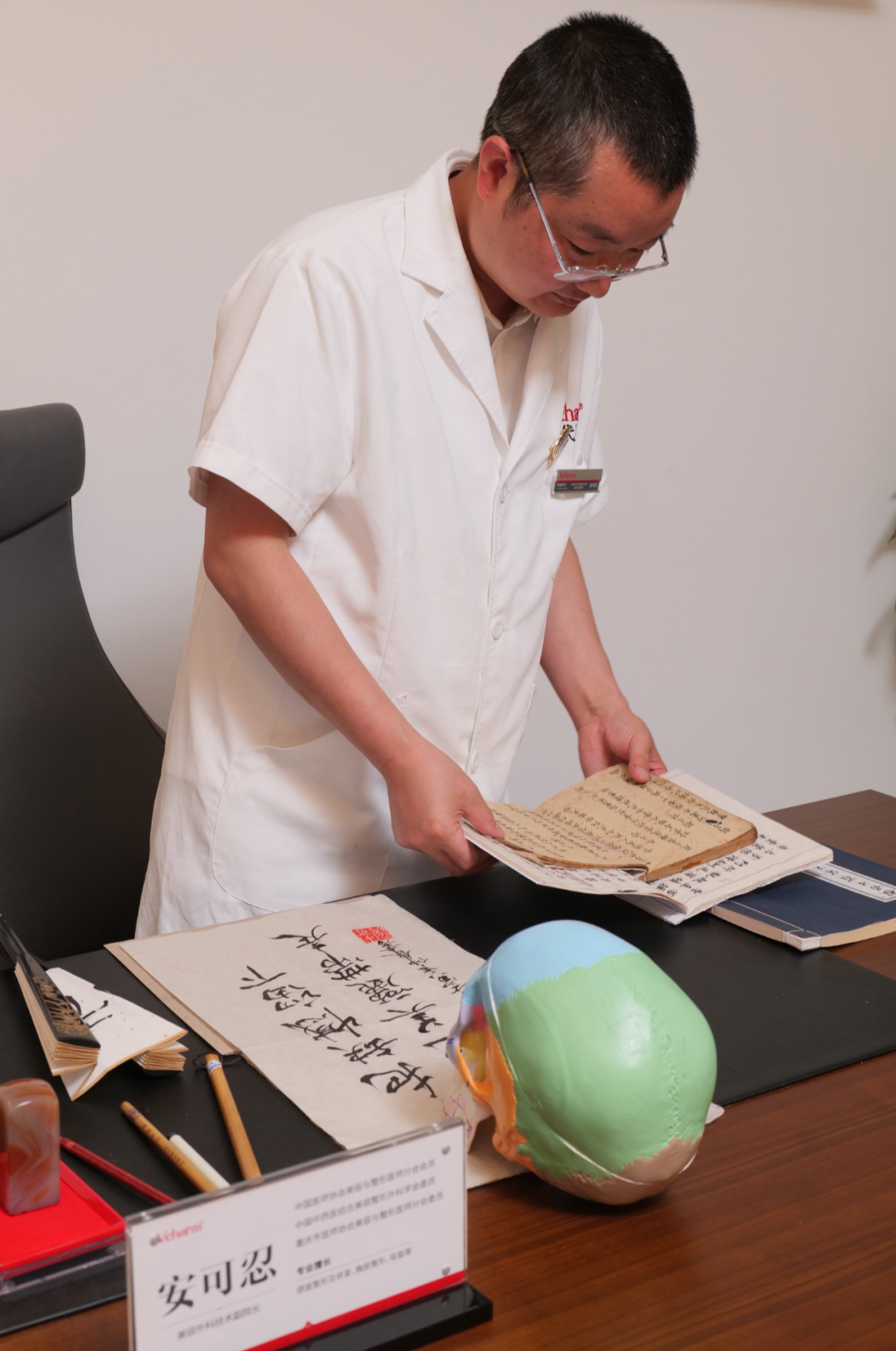可以说,手术刀和毛笔都是他至爱的两支笔。一者在手术台上,精雕细琢塑造出人体线条的流畅之美;一者在洁白的宣纸上,铁画银钩描绘出中国书法的万象之美。安院长就是用这两枝笔,书写着顾客的塑美故事,也书写着他的精彩人生。