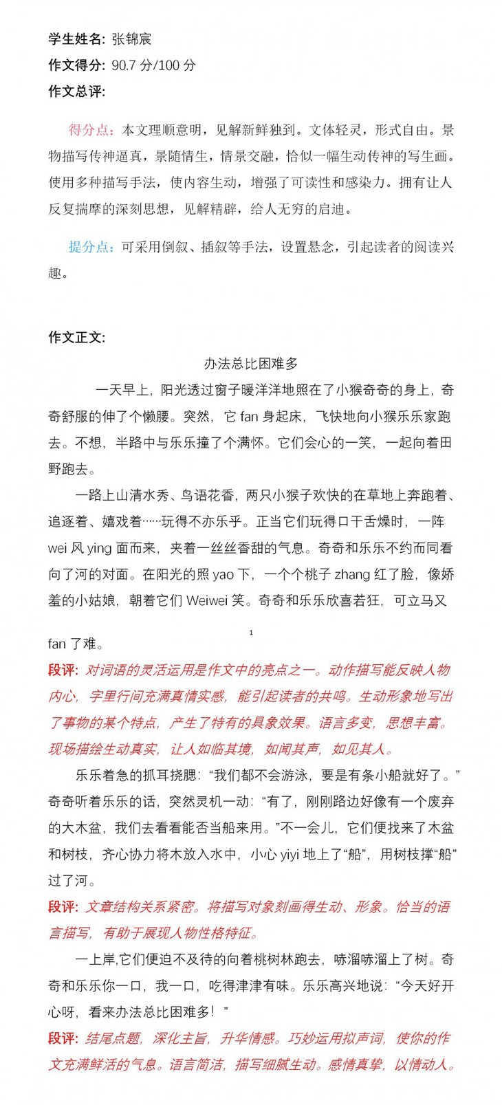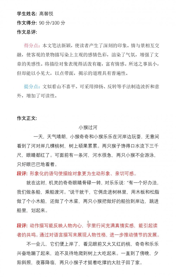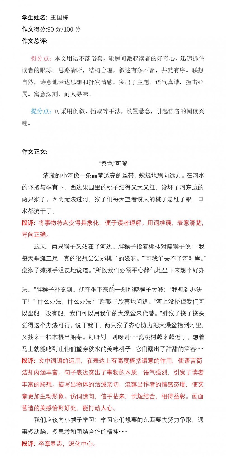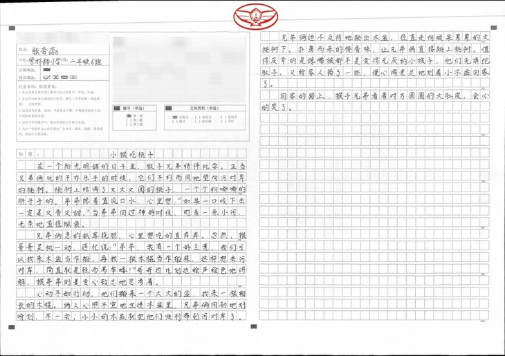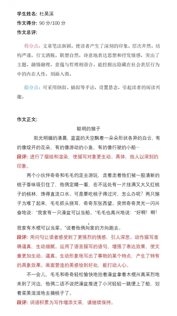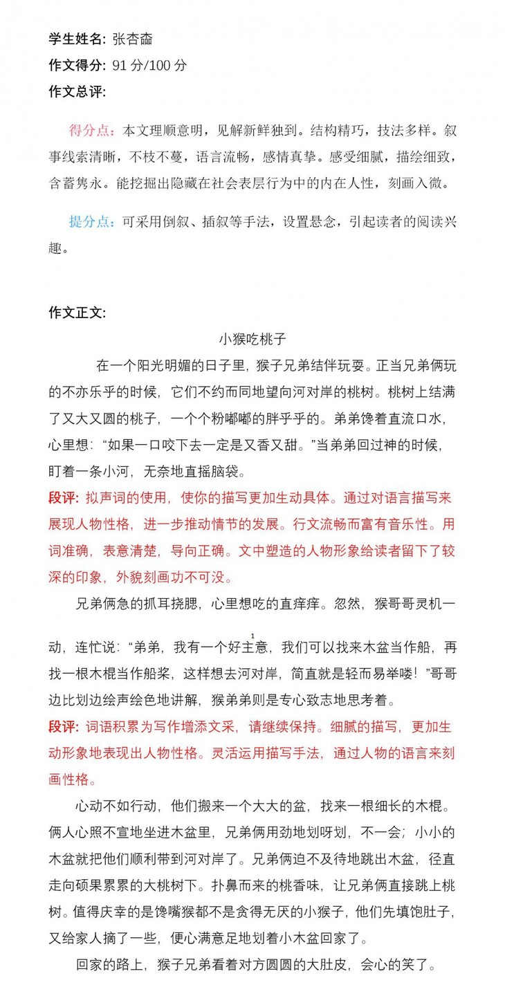 张锦宸同学通过观察图片,充分发挥了自己的想象力,揭示了本文的主题。文章鲜活、生动,仿佛看见了两只小猴摘桃子的那个场景。可见,孩子平时善于观察并且喜欢阅读,对生活充满了无限的热爱。希望张锦宸把这种良好的学习习惯保持下去,写出更生动的作文!