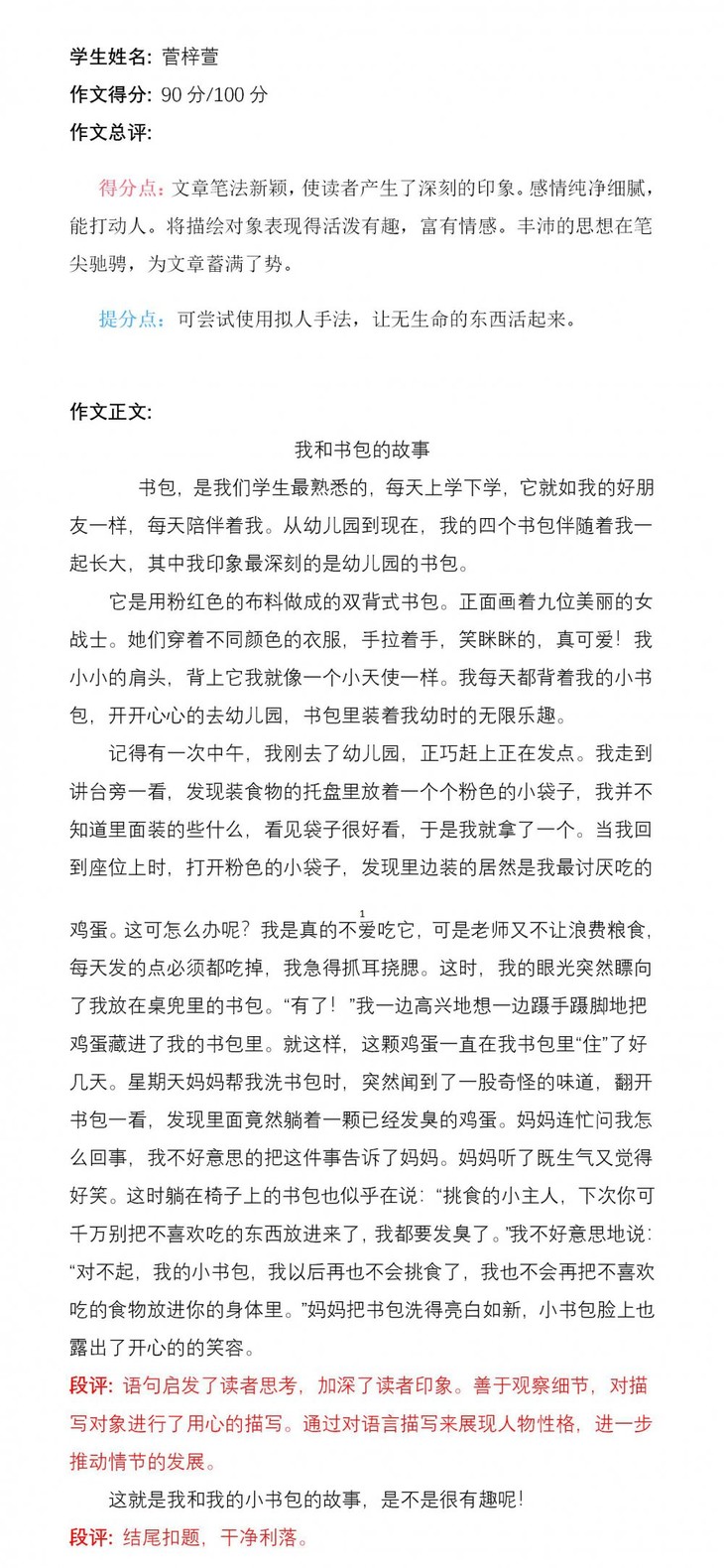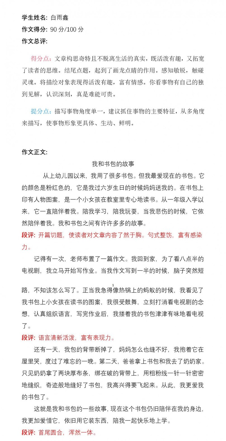 小作者通过具体的事例写出了“我”和书包之间的故事,内容真实,字里行间饱含着小作者对书包的珍爱之情。层次分明,文字质朴,情动而辞发,方有这样的习作!