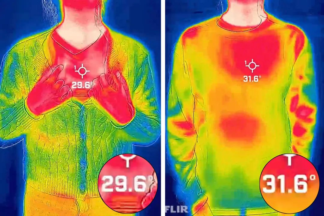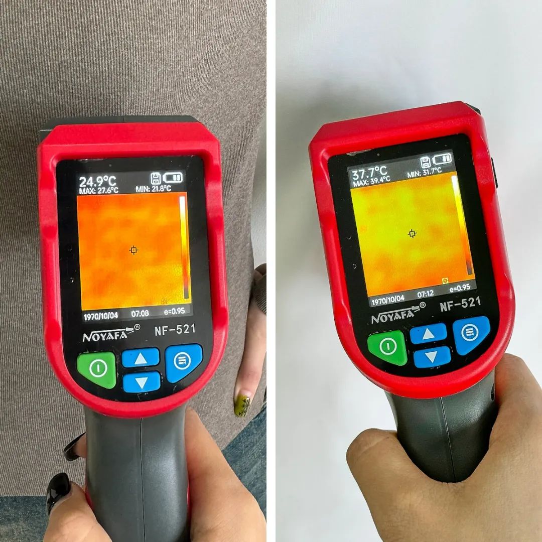 为了让大家直观得感受到它到底有多保暖,我们特意找来了红外热成像,给大家测试一波它的自发热效果。 大家可以看到在穿上羽绒T后,体温从原本的24.9℃左右,上升到了37.7℃左右~ 这种体感,就像冬天的阳光照在身上一样暖和舒服,谁穿谁知道~