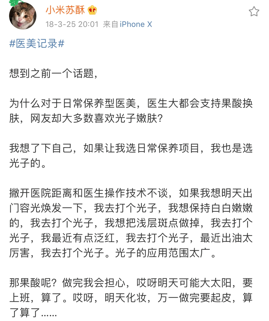 光子我一定会坚持打下去,因为这对我的皮肤状态确实有很大帮助。初次尝到医美的甜头后,终于有点理解为什么大家都说该做医美的时候一定要下手了。🉑