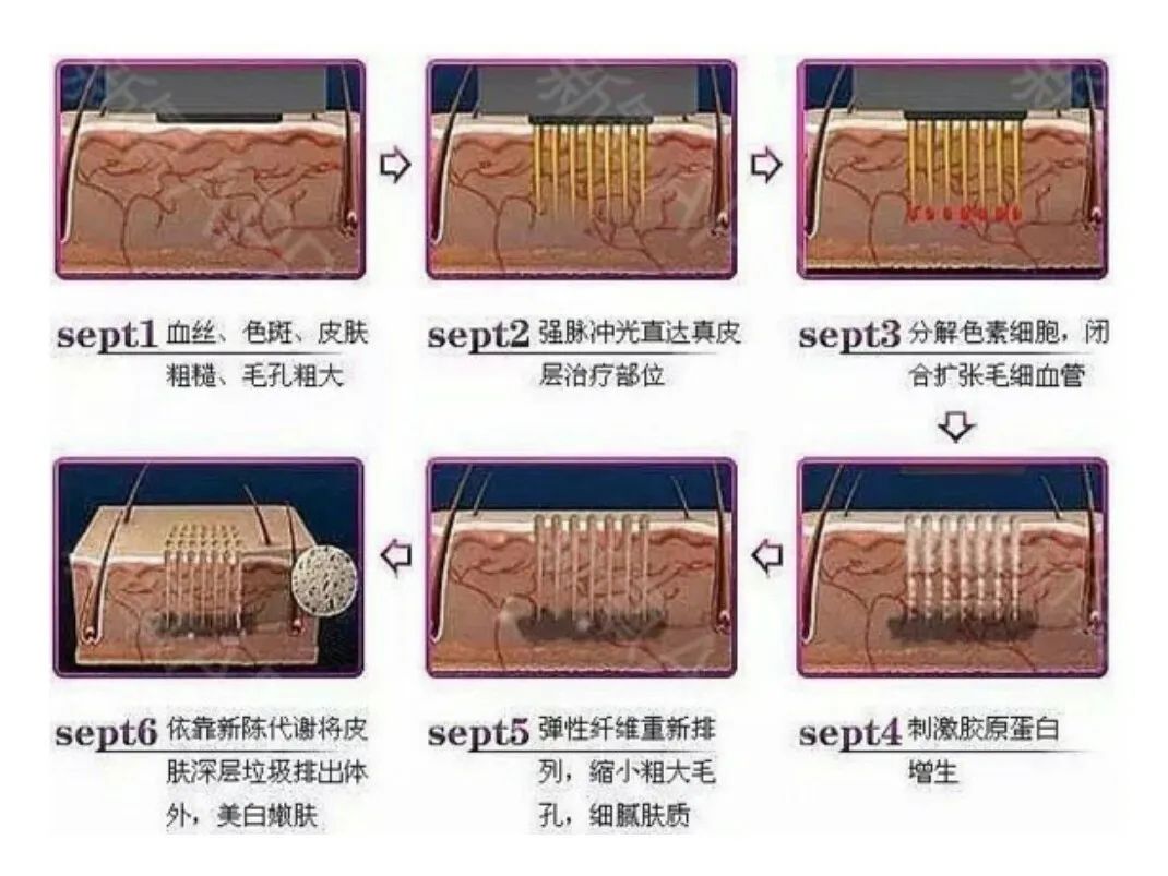 560-1200nm左右的波长被皮肤深层组织中的水分子吸收,水分子吸收热量后加热,光能转化成热能,皮肤组织受热后刺激新的胶原生成以及皮肤细胞再生,把毛孔和细纹都撑了起来。