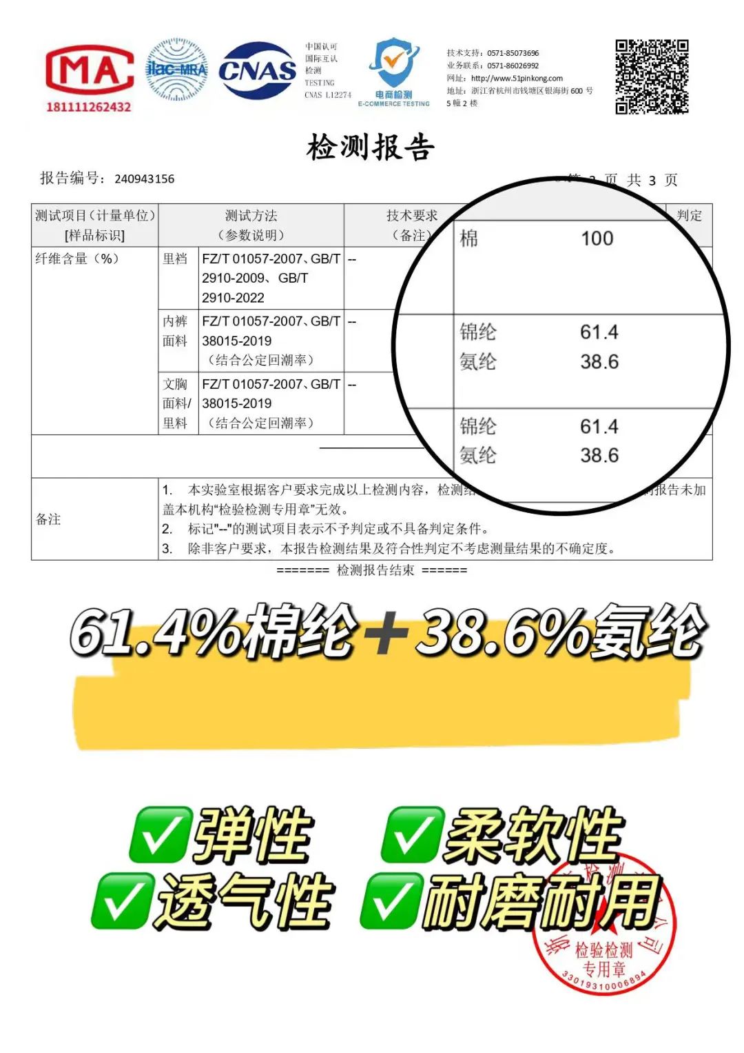 这款内衣内裤套装采用61.4%棉纶和38.6%氨纶的混纺面料,兼具了弹性、柔软性、透气性、耐磨性和耐用性等多种优点,为你提供舒适的体验。