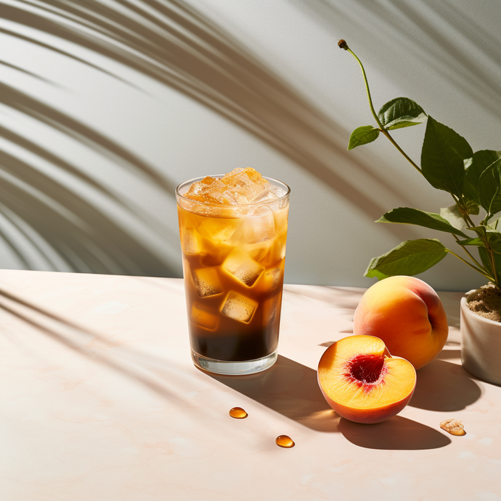 2、取一干净杯子,杯子中倒入白桃汁,再 倒入萃取好的咖啡液,搅拌均匀即可。