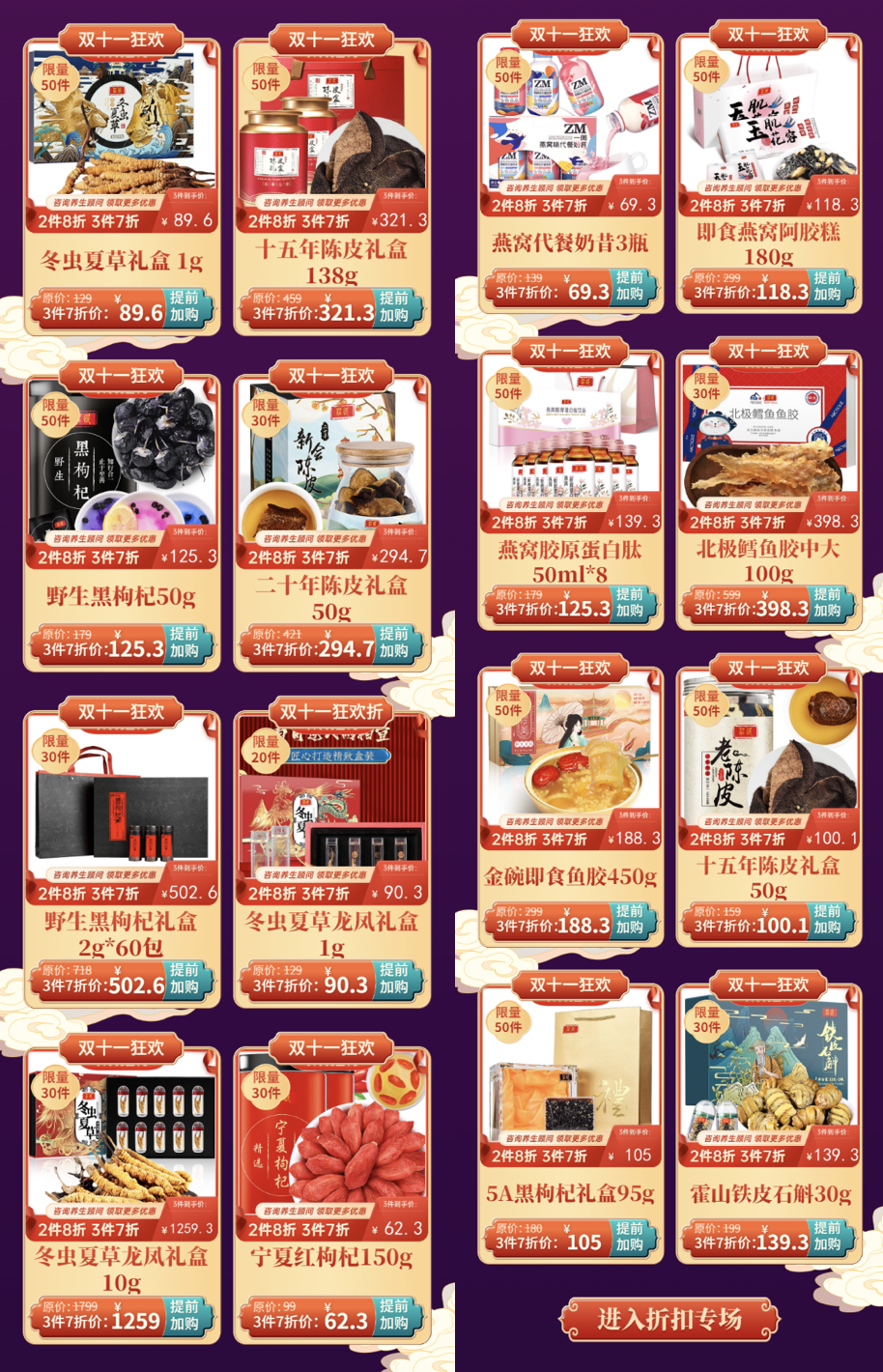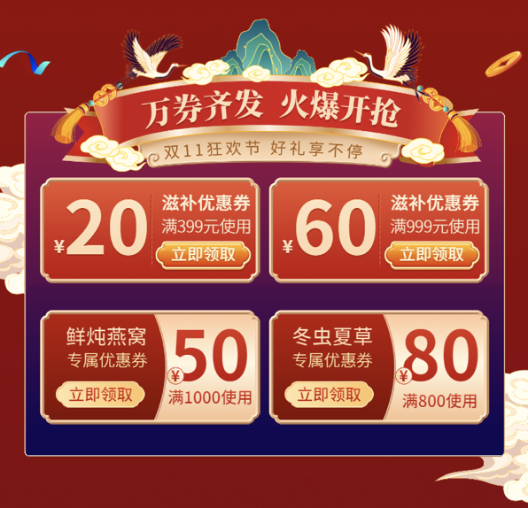 冬日进补一直都是被传统养生所推崇,无论是食补还是中医理疗的方式都可以,以上没有你中意的产品,这里有为你送去满额相减的活动,更有万券大礼包相送,总有一个适合你!