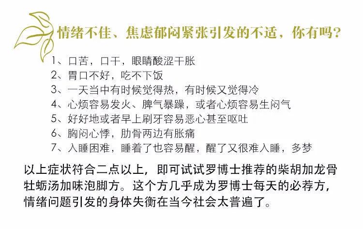 最后,他们来找我,见了面,我查舌诊脉,判断这是因为情绪引起的,中医叫肝气不舒,我也建议她用柴胡加龙骨牡蛎汤加味这个方子每天泡脚,对舒肝理气有非常好的效果。
