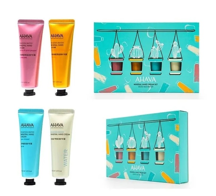 如果喜欢小巧便携,可以考虑入手AHAVA的这个4支装礼盒,里面有4支不同的30ml护手霜,小巧便携,而且都是比较热门的款:
