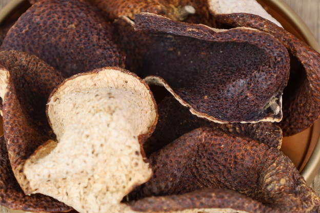 陈皮性辛、味苦;归脾、肺经。具有健脾和胃,行气宽中,降逆化痰的功效。