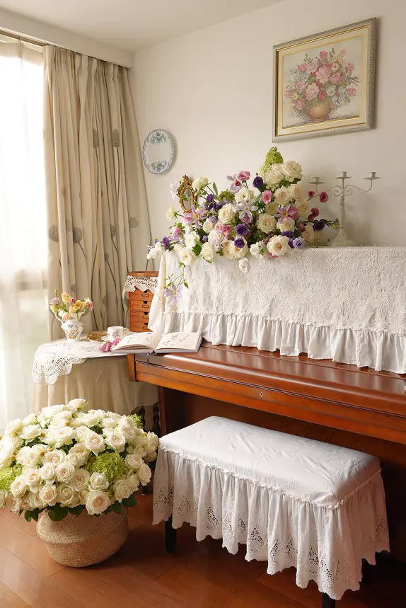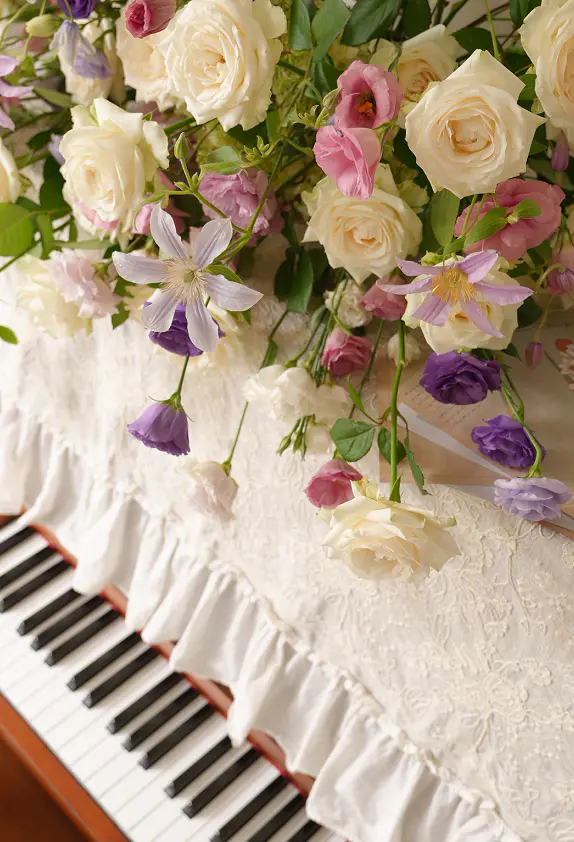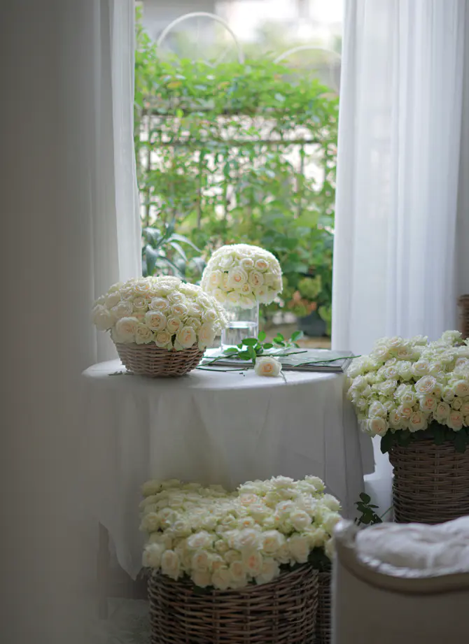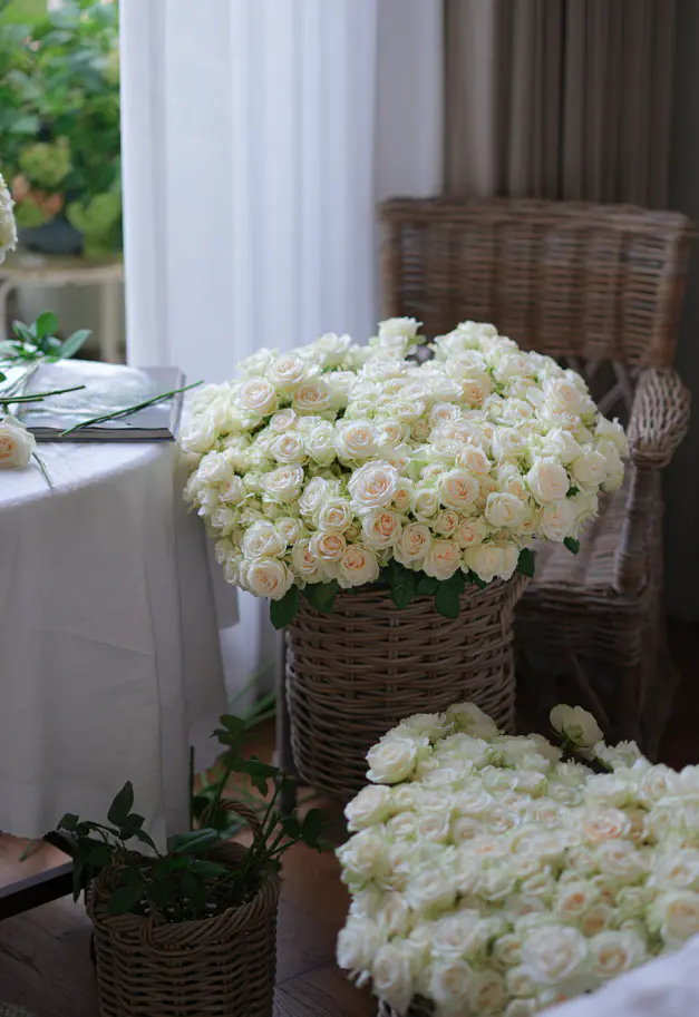 💐花材处理:深水醒花1-2小时,剪根插水养护至半开状态
