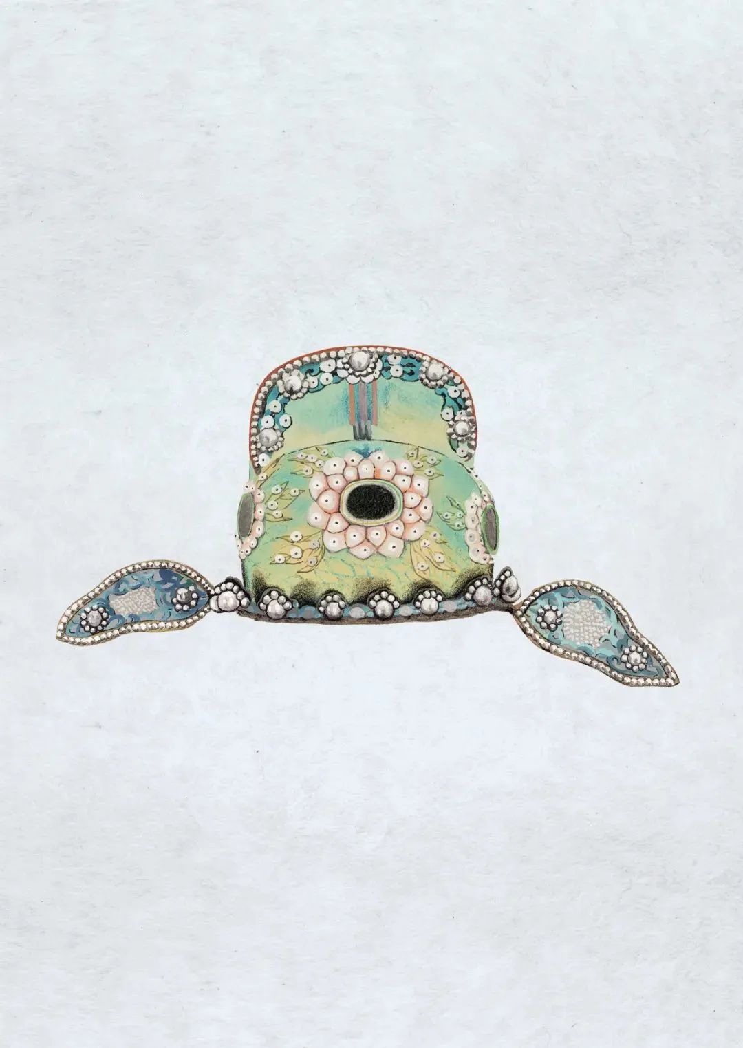 ● 清 月白色暗花绸串玻璃珠朵花纹学士盔