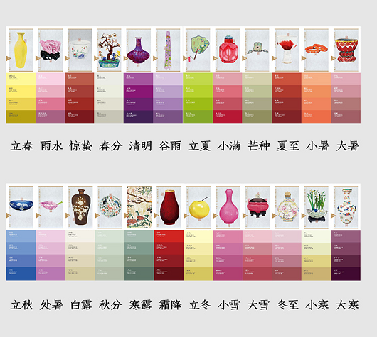 又根据24节气、72物候,从几十万件故宫文物中选取应时应节的96件,以手绘的方式复原文物被磨损的色彩,提取传统色色谱。