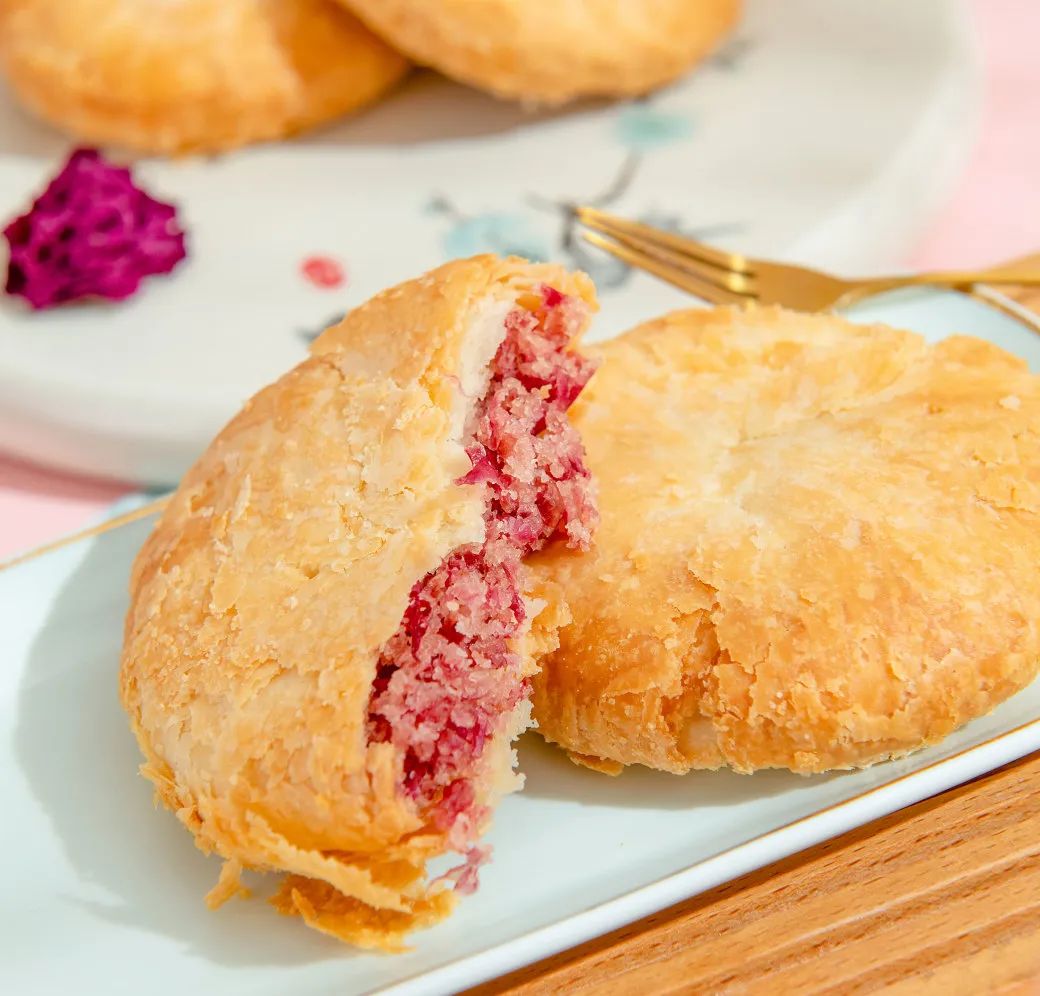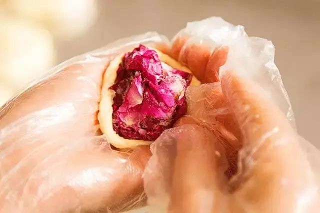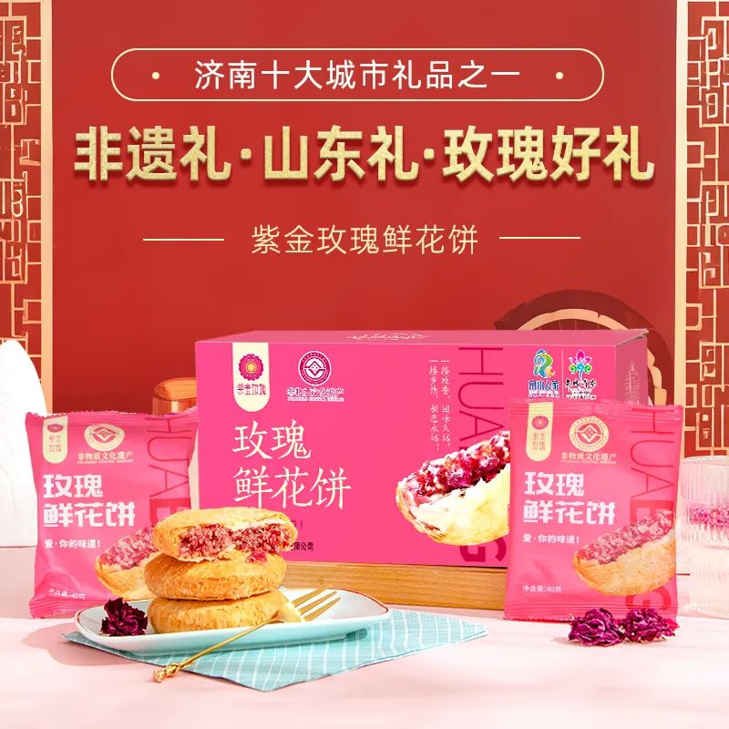 紫金玫瑰鲜花饼采用传统酥式月饼的制作工艺,饼皮酥软。健康新鲜,饼中花的好味道,由天然食材制作,玫瑰花馅是一切美味的根源。以平阴重瓣红玫瑰为馅,选用花型好、饱满的花瓣,这样新鲜出炉的鲜花饼酥软爽口、花香浓郁、沁人心脾。