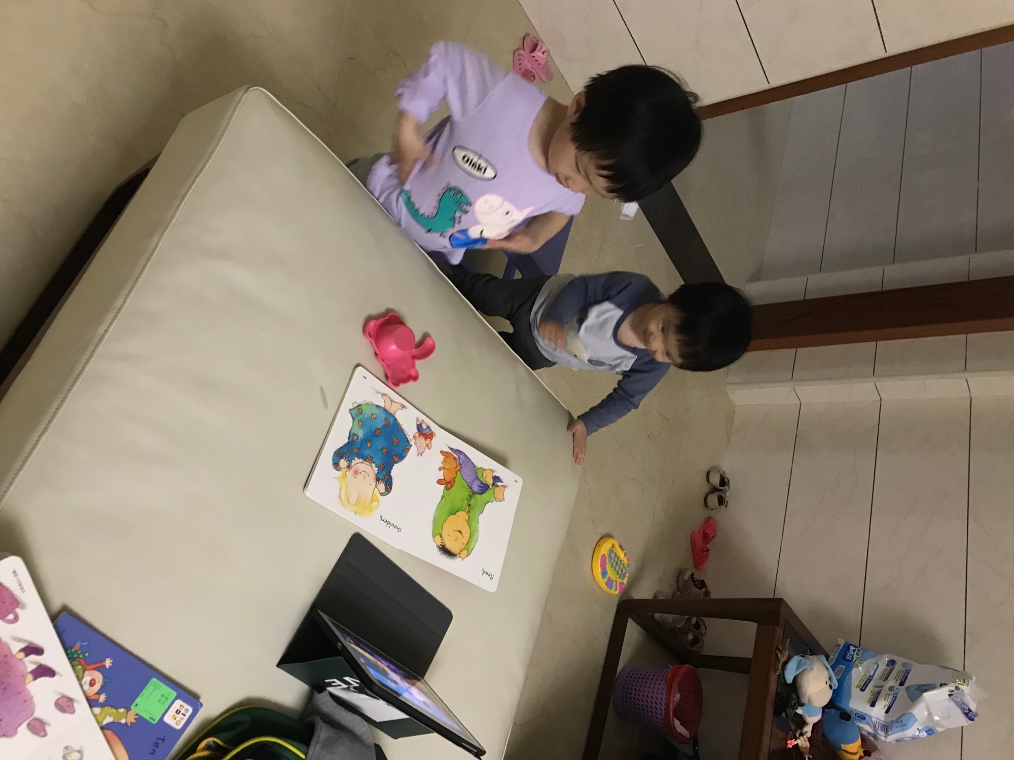 我们先是读了两遍绘本,熟悉里面的单词,然后播放视频,跟着唱歌和做动作。