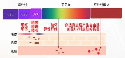 市面上大部分防晒产品,基本只能抵御紫外线,但太阳光里除了紫外线还有红外线和可见光,紫外线仅仅只占阳光光谱的10%,红外线和其他可见光也会进入到真皮层,加速皮肤老化。