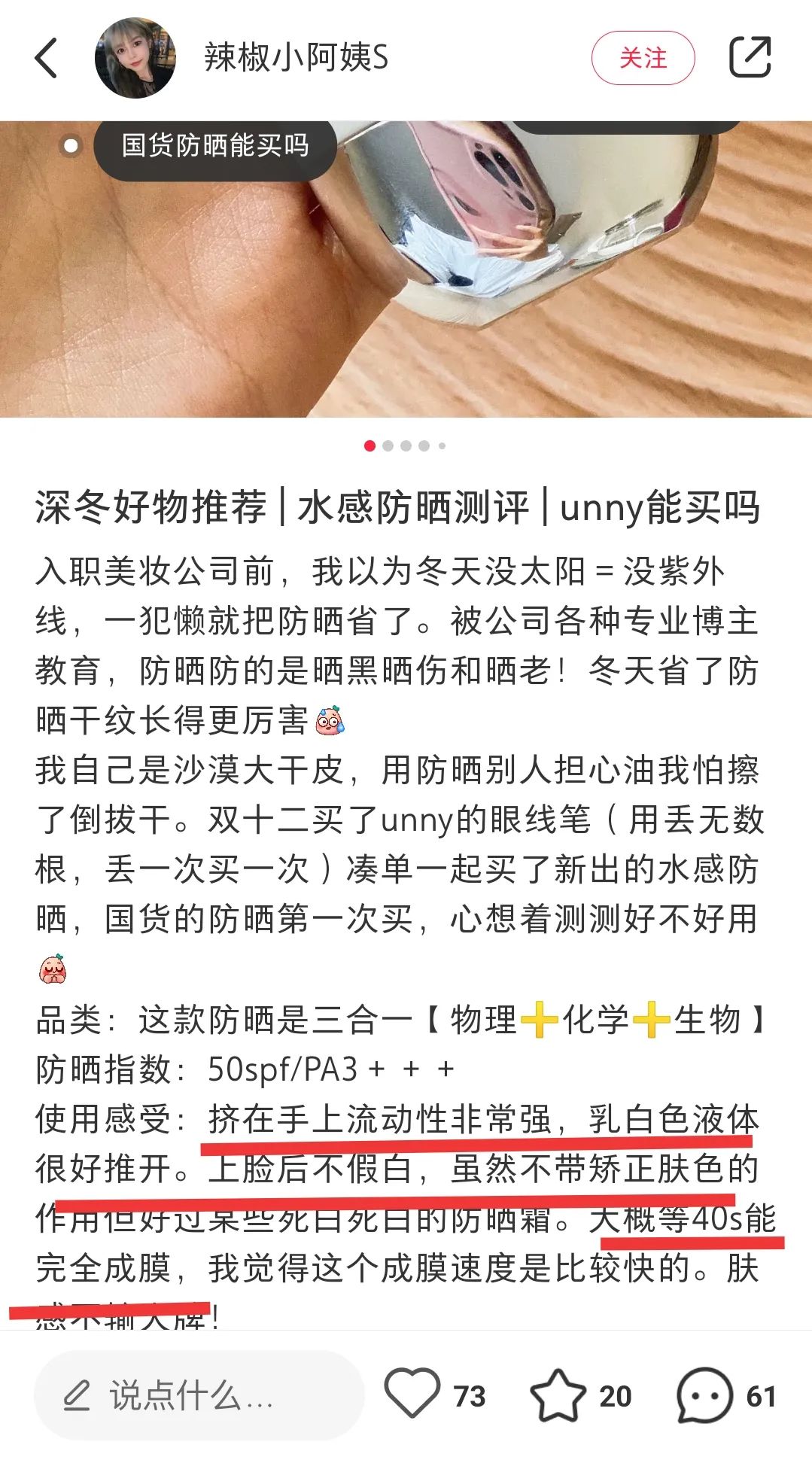 而且在某书上也深受受大家喜爱,入一支囤一支的消耗品,在冬季不敢随意换防晒的同学在夏季可以有些尝试,反正我是被实力说服了哈哈。