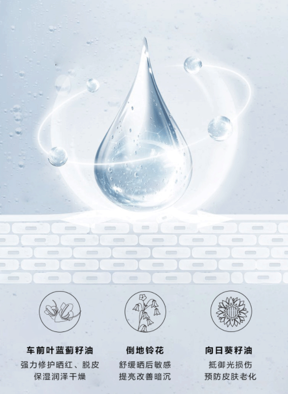 比较惊喜的点是添加了养肤的成分,车前叶蓝蓟籽油、倒地铃、向日葵籽油构成,防紫外线的同时,还能预防红斑产生,有效锁住肌肤水分,维持肌肤滋润度!缓解紫外线对肌肤的刺激,修护晒后肌肤!