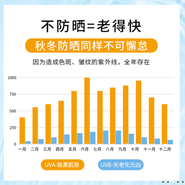 此外,紫外线与皮肤健康关系非常密切, 在日常皮肤防护中,尤其在紫外线最最强烈的夏季,一定要加强对UVA及UVB两种波段的全面防御,才能有效地预防和减轻皮肤的光辐射损伤。