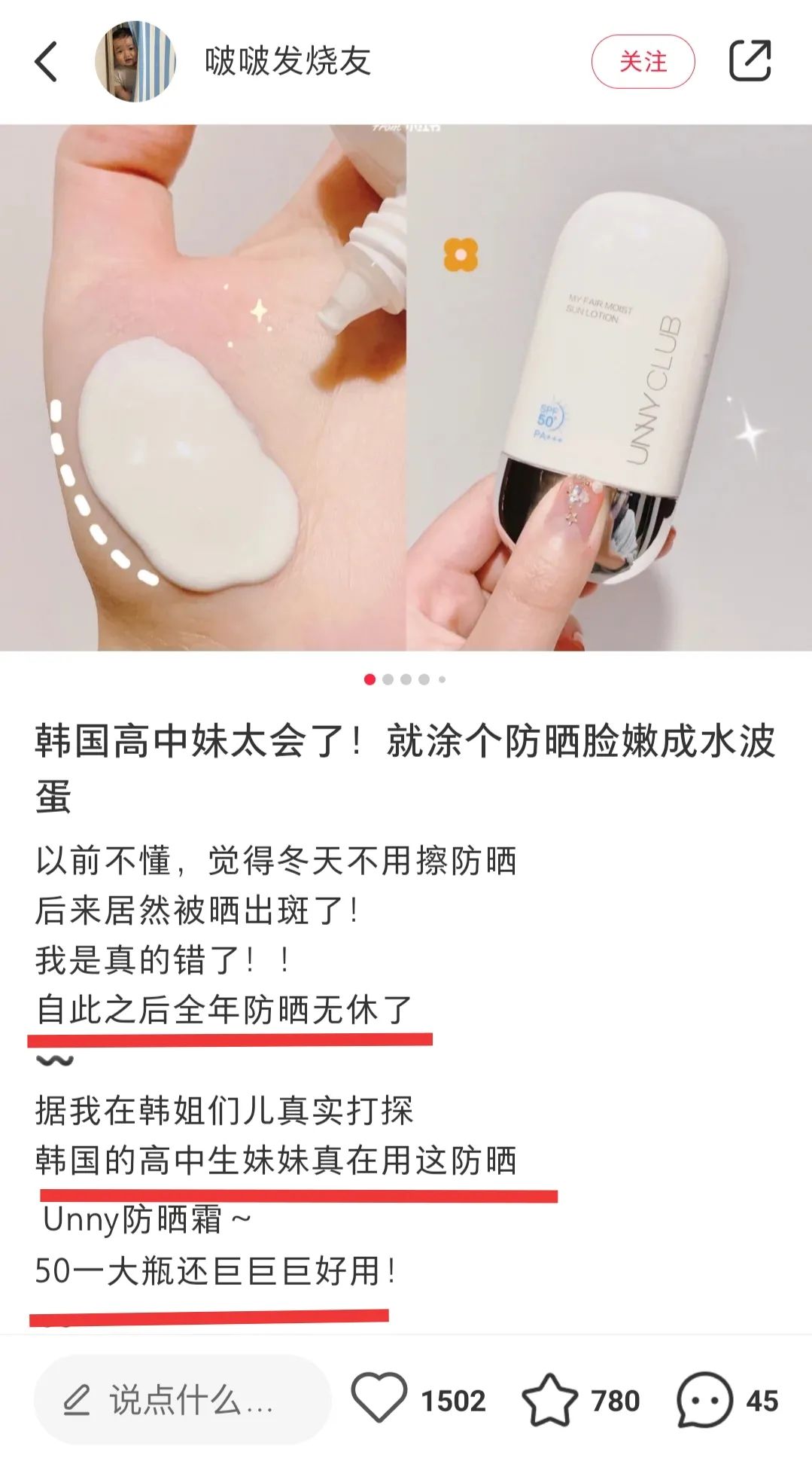 市面上能做到防晒+养肤的防晒霜,少之又少,不过小编还是帮你们挖到了一支双效合一的高倍防晒霜,它就是——UNNY水漾防晒乳。