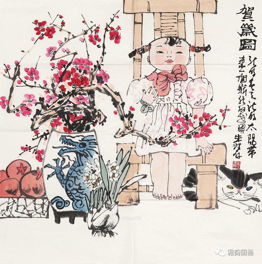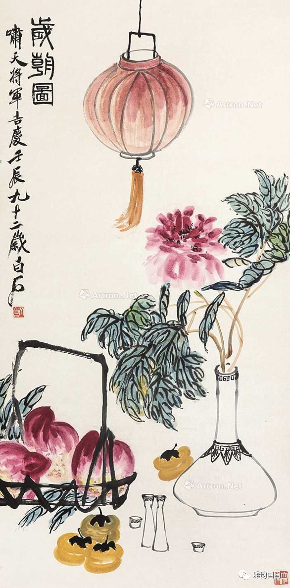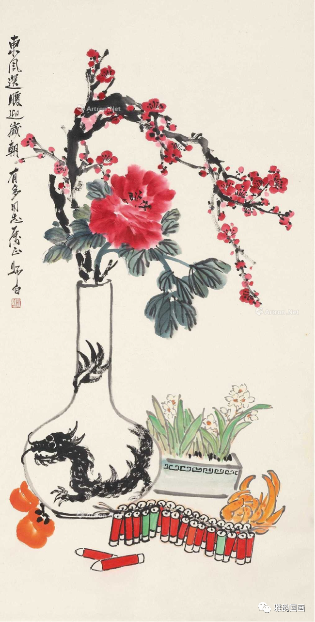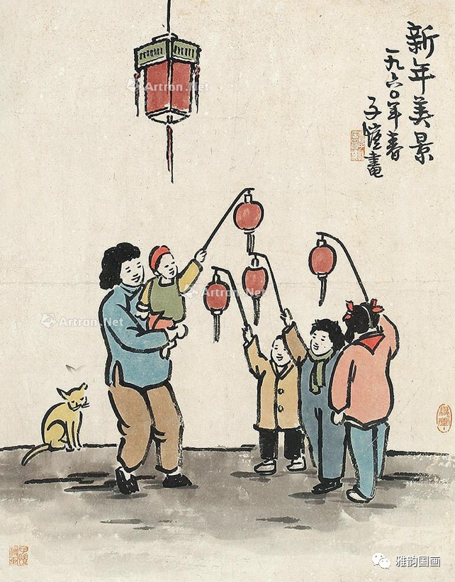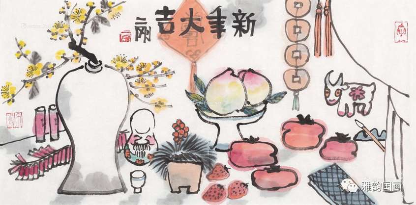 新年,人们会在春节张灯结彩,附上对来年生活的美好祝愿。让我们一起欣赏国画大师是如何描绘这富有美好寓意的新年场景。