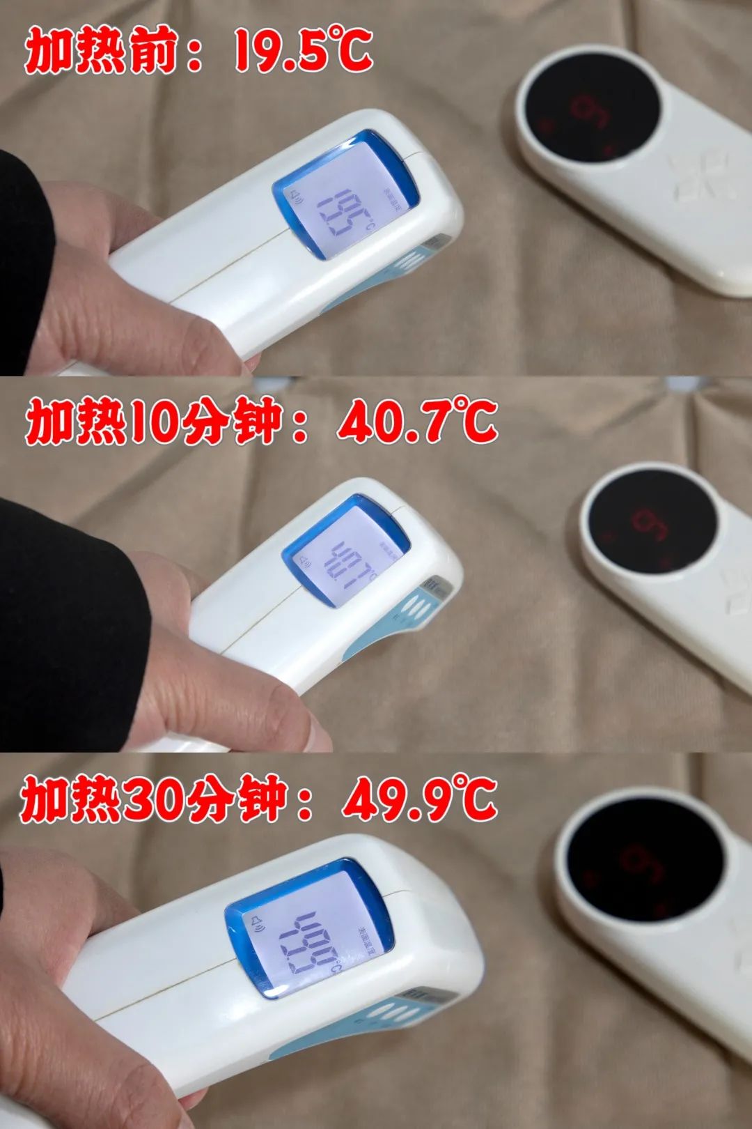 我们做了个实验,插电后,测试10分钟、30分钟温度,分别为40.7℃、49.9℃,加热效果杠杠的!