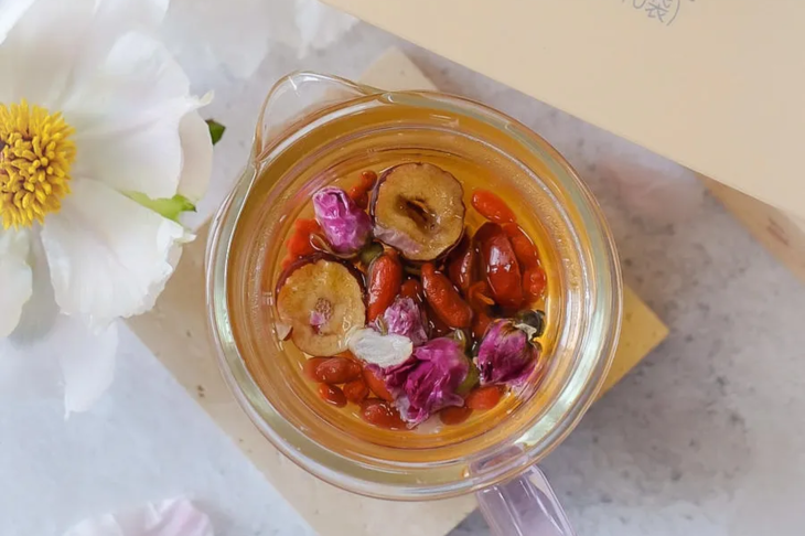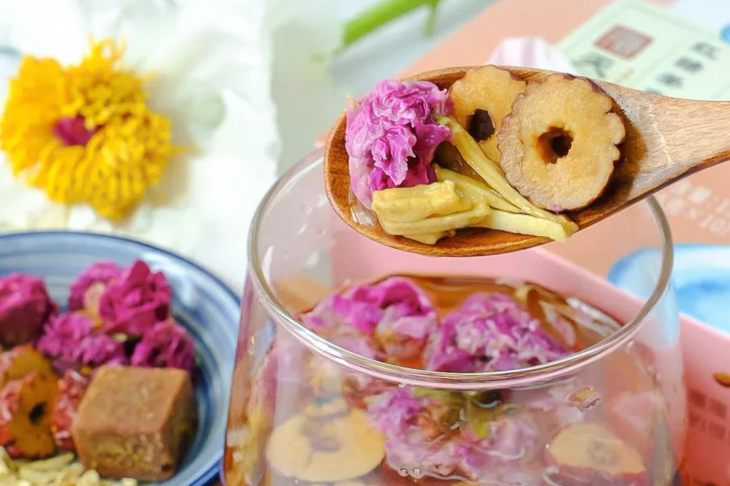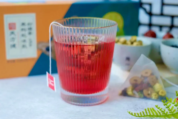 「玫瑰桂圆佳人茶」,选用玫瑰花、红枣片、人参片、桂圆、枸杞五种道地药食原材料。滋养身心,调养气血,其冲泡的口感甘醇,香味浓郁。