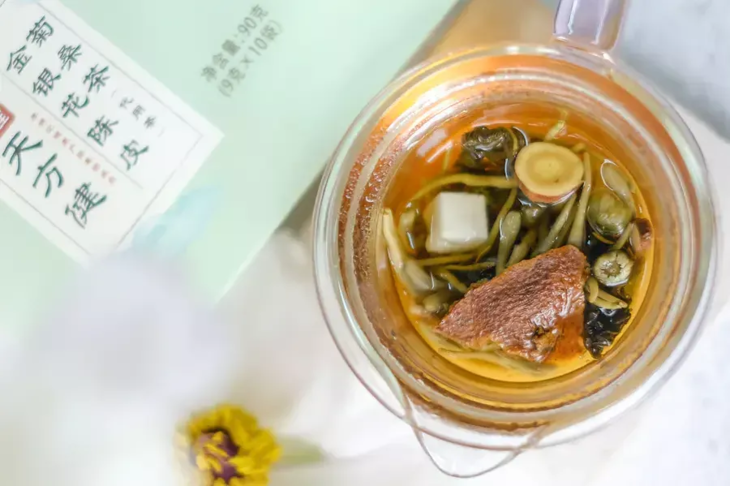 「金银花陈皮菊桑茶」,精选金银花、菊花、橘皮、甘草、桑叶、茯苓,六味药食互补,清热降火,有助提高免疫力,抵御病菌病毒。