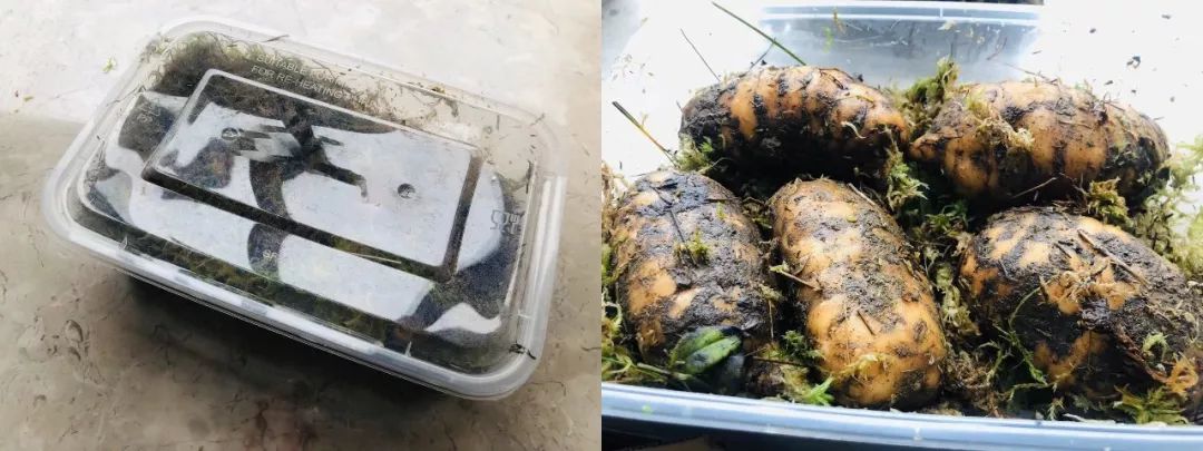 新鲜现挖的天麻,带着一点泥土,盒子里面装有长在水里的海花草,能更大程度的保鲜。