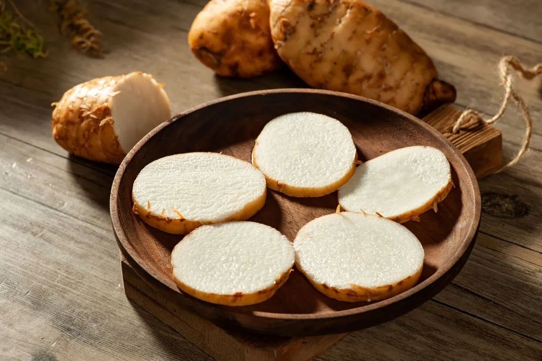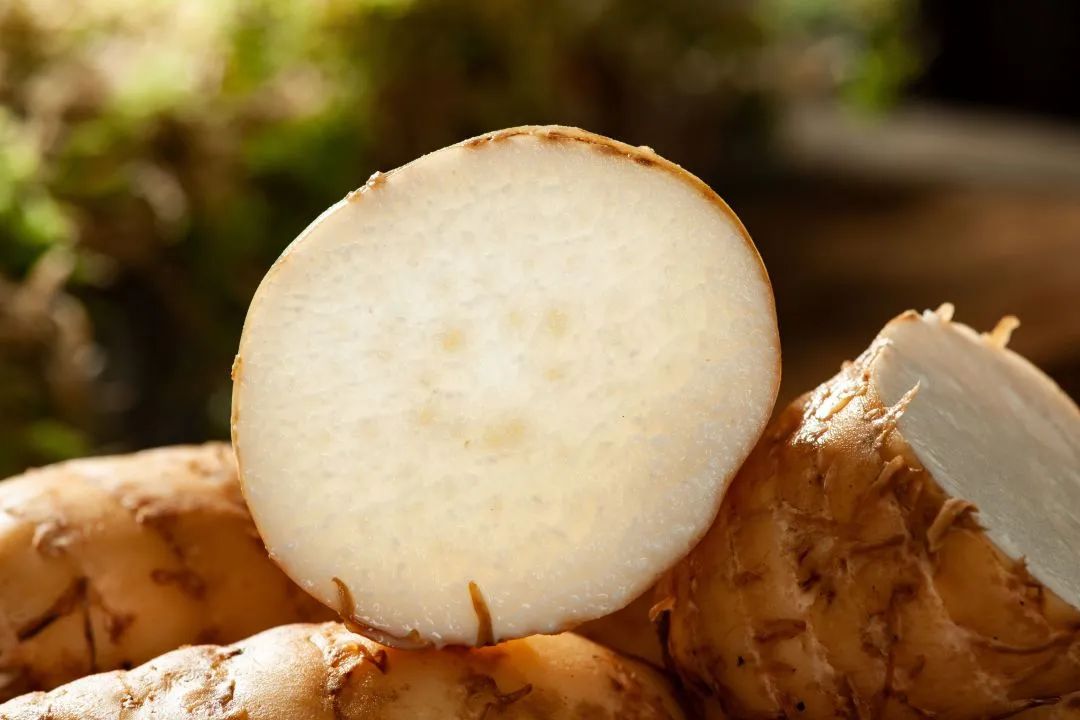 新鲜的天麻切开后浆汁充盈,白色的肉饱满紧实又脆嫩。用刀切下去能听到咔嚓一声,肉质比山药还细嫩。