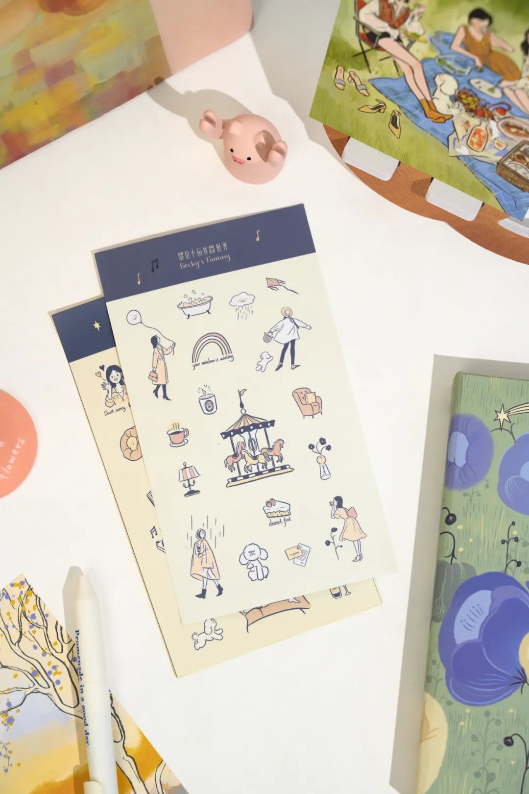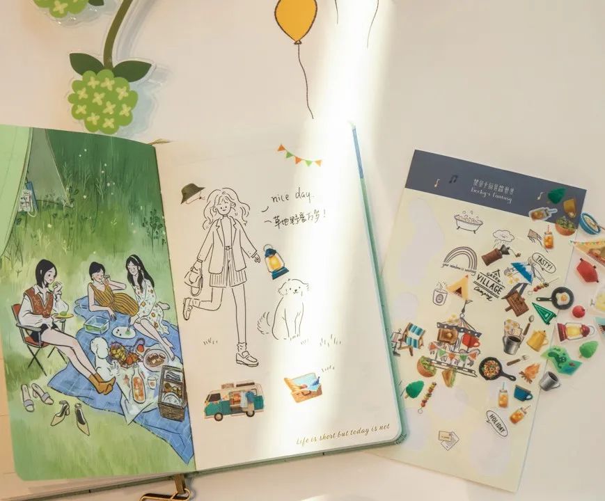 买手帐的惯例是会送儿力力画的小贴纸。今年也有2张,饱和度比较低,和手帐的画风一致,有些元素是和插画呼应的~▼