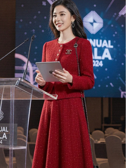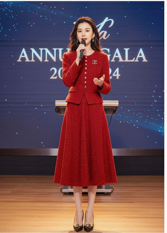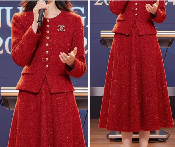 红色自带强大气场,是年会、晚宴、主持的焦点色,能快速抓住视觉注意力面料里的细闪金属丝,避免了纯红的单调,让原本浓郁的正红多了「低调光泽感」