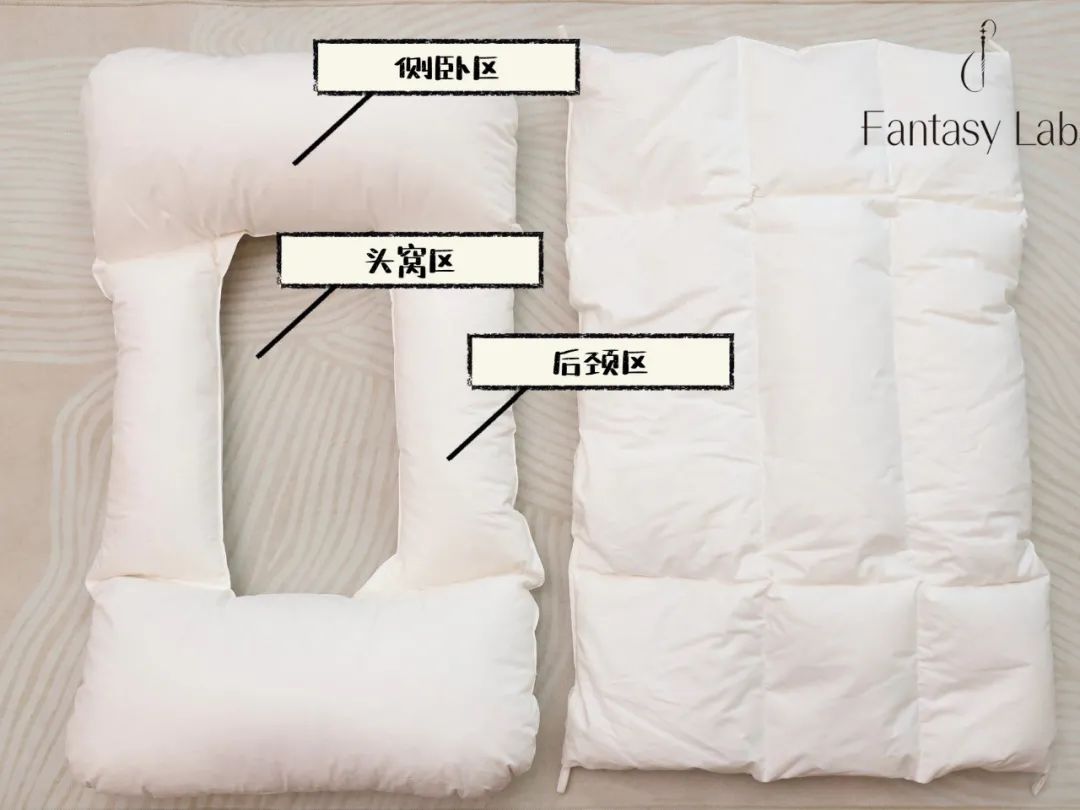 是不是光看外表没有感受到我说的厉害在哪。呐,打开给你们看看里面,是两个嵌套在一起的羽绒枕头,我简单标了下最里面这个回字形枕头内芯的分区👇