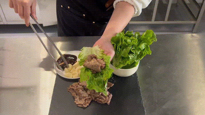 把煎好的上脑薄切沾上调味汁、放一粒香蒜,一起裹入生菜即可