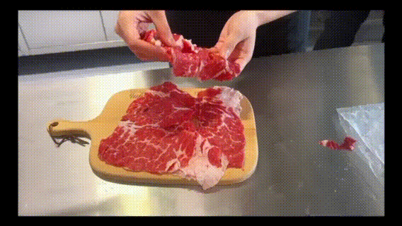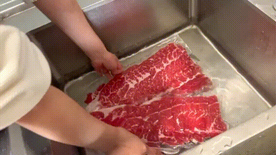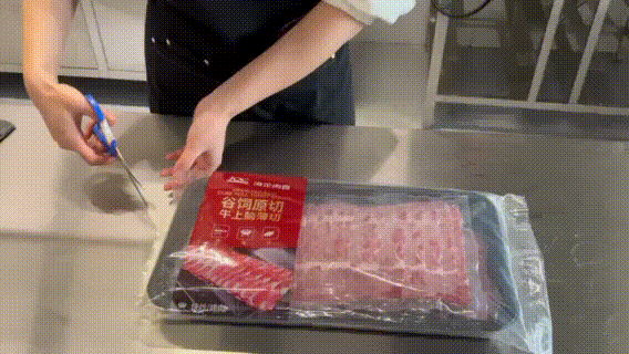 取出上脑薄切,撕开包装。(根据需求取量,1-2人拆一袋即可)