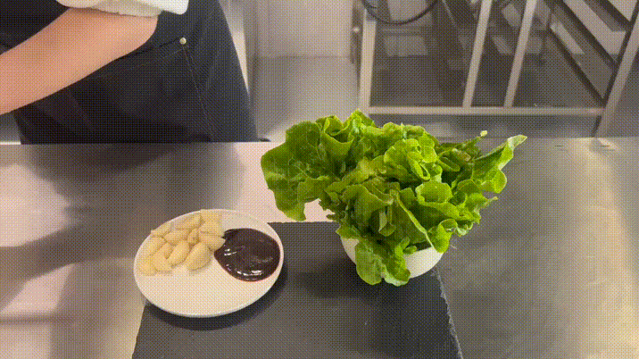 准备生菜和黑胡椒汁、香蒜,取出煎好的肉片