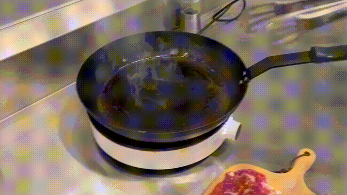 锅中倒油预热至冒烟。推荐使用色拉油或橄榄油,以免掩盖上脑的自然风味。