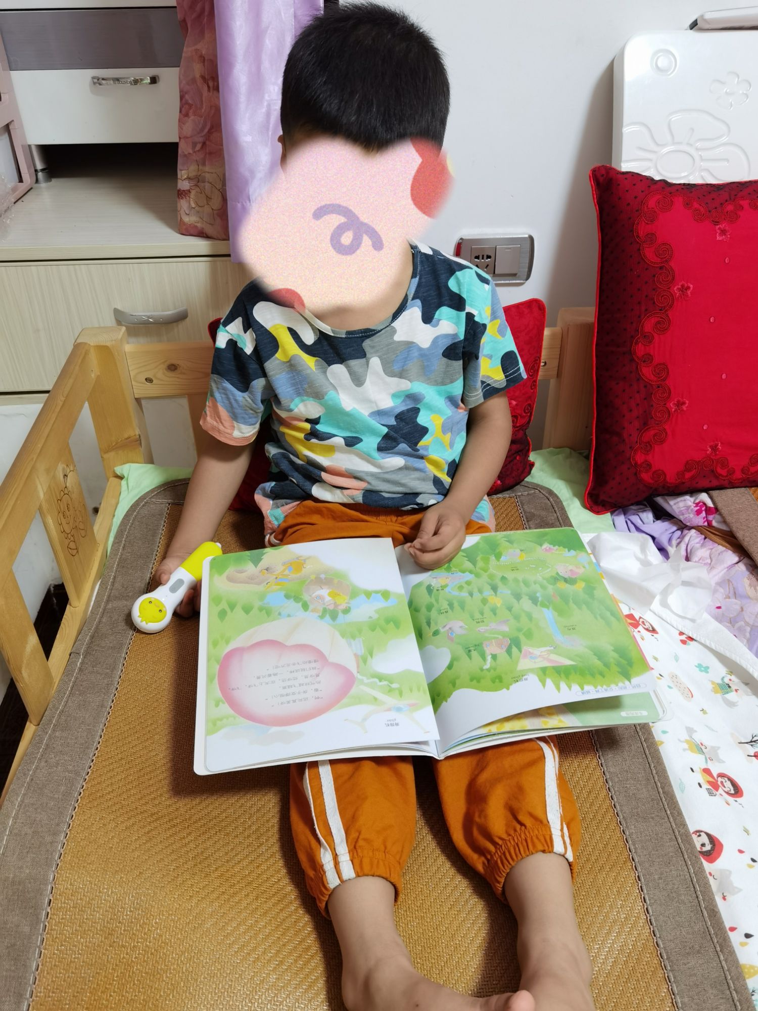 准确的来说,今天是“小鸡球球”给他讲故事,收到点读笔很久都没拆,一直到儿童节才把它作为节日礼物送给了宝贝,他非常喜欢,这几天每天放学回来都要玩,我都还没研究好怎么个玩法,他自己就能找书出来看了,